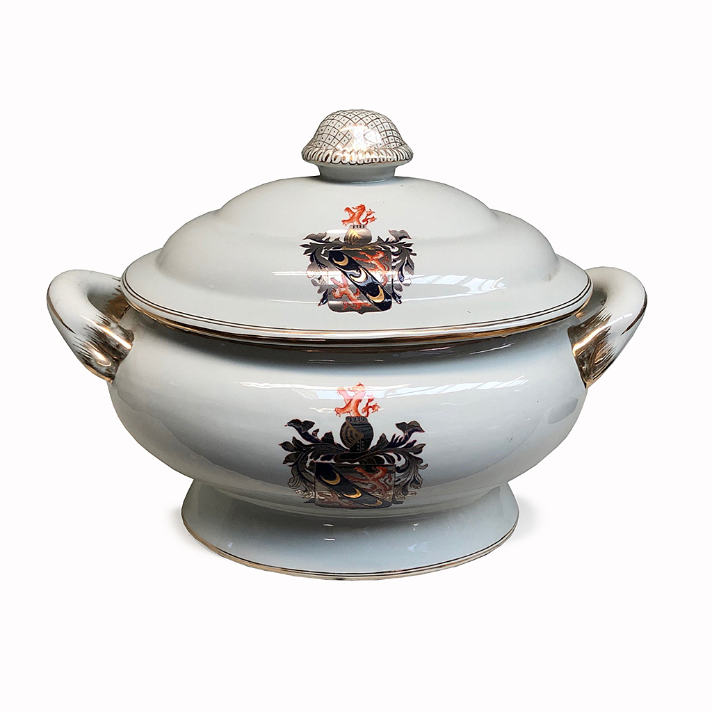 LARGE OVAL CHINESE EXPORT CREAM TUREEN AND LID WITH NAVY HERALDIC CREST