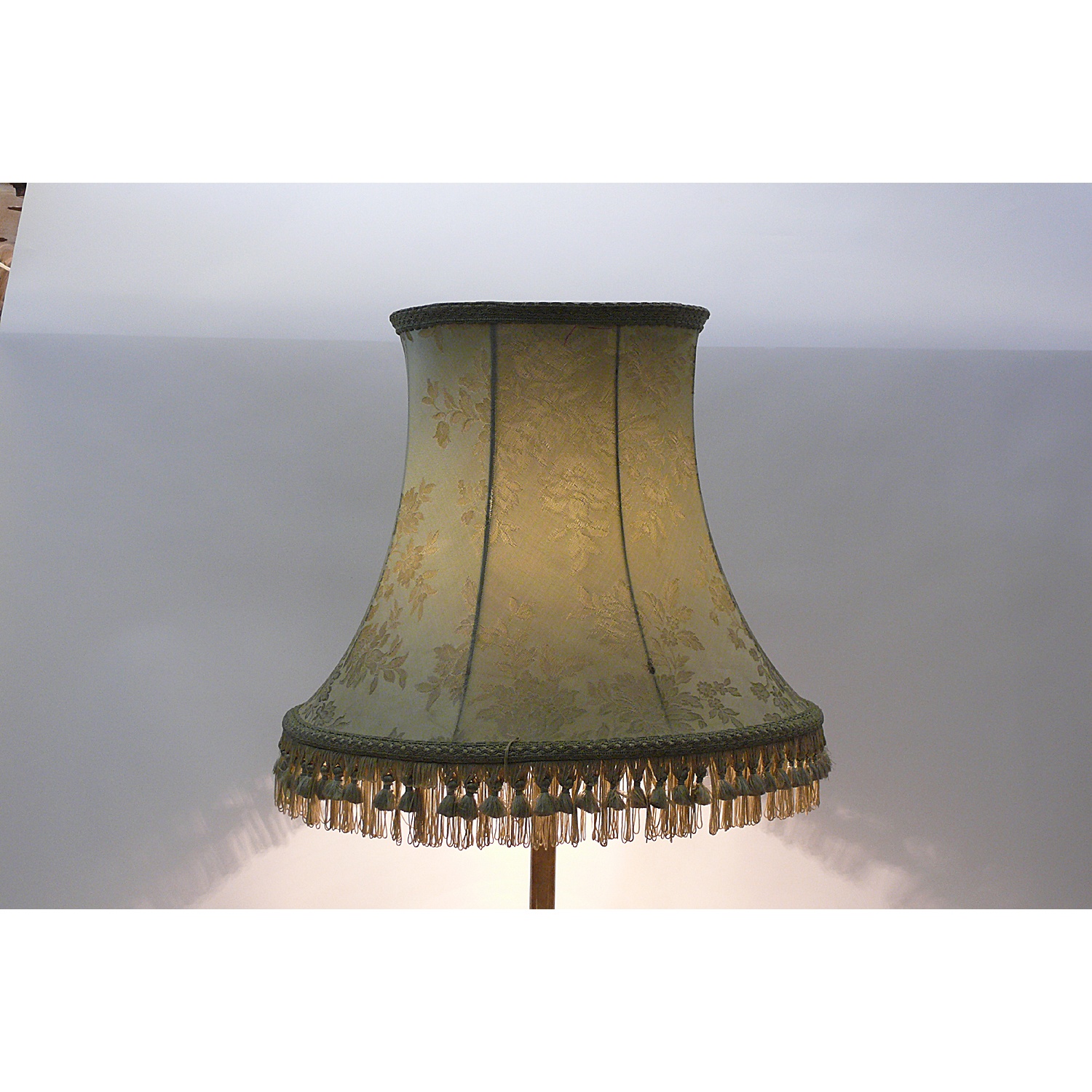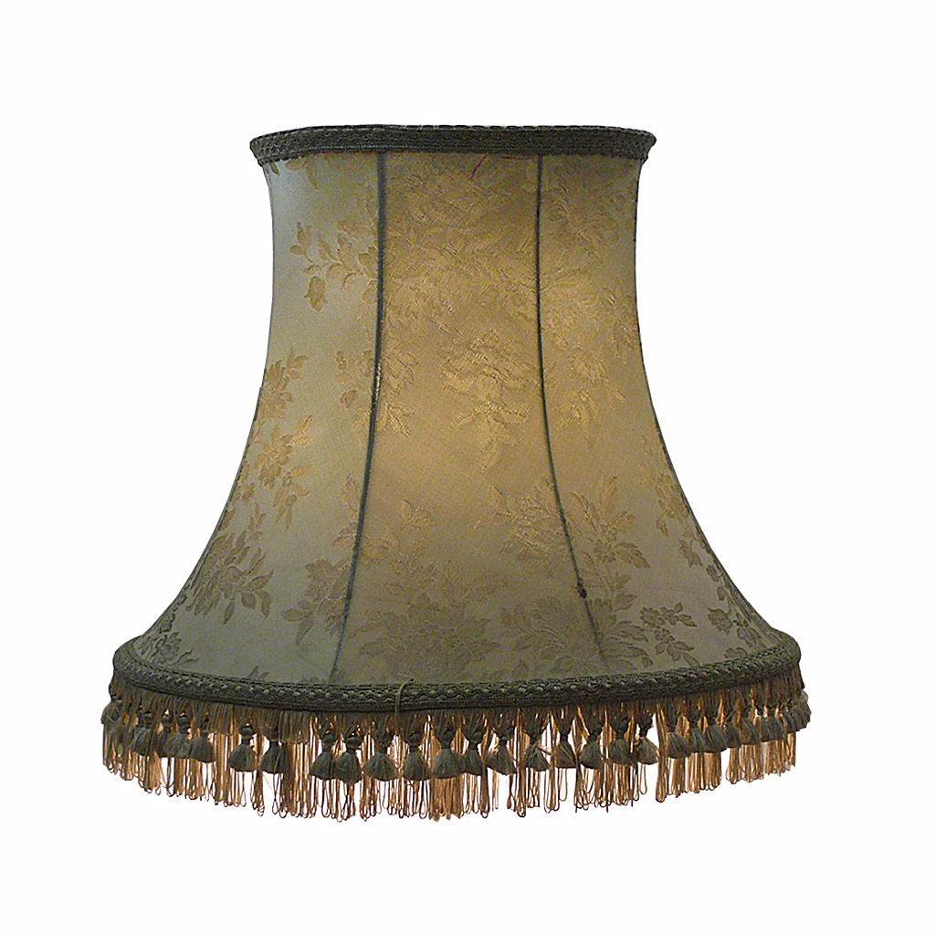LARGE PALE GREEN DAMASK LAMPSHADE WITH TASSEL FRINGE 52 CM DIAM.