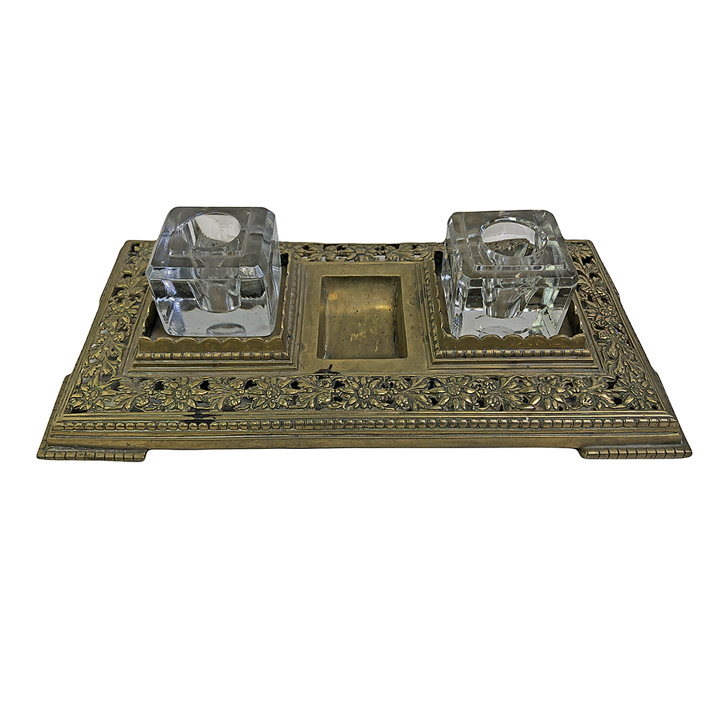 LARGE RECTANGULAR ORNATE BRASS INK STAND WITH TWO GLASS INKWELLS 36CM L.