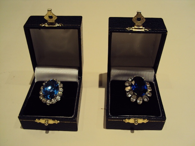 LARGE REPLICA DIAMOND AND SAPPHIRE ROYAL ENGAGEMENT RING WITH BOX