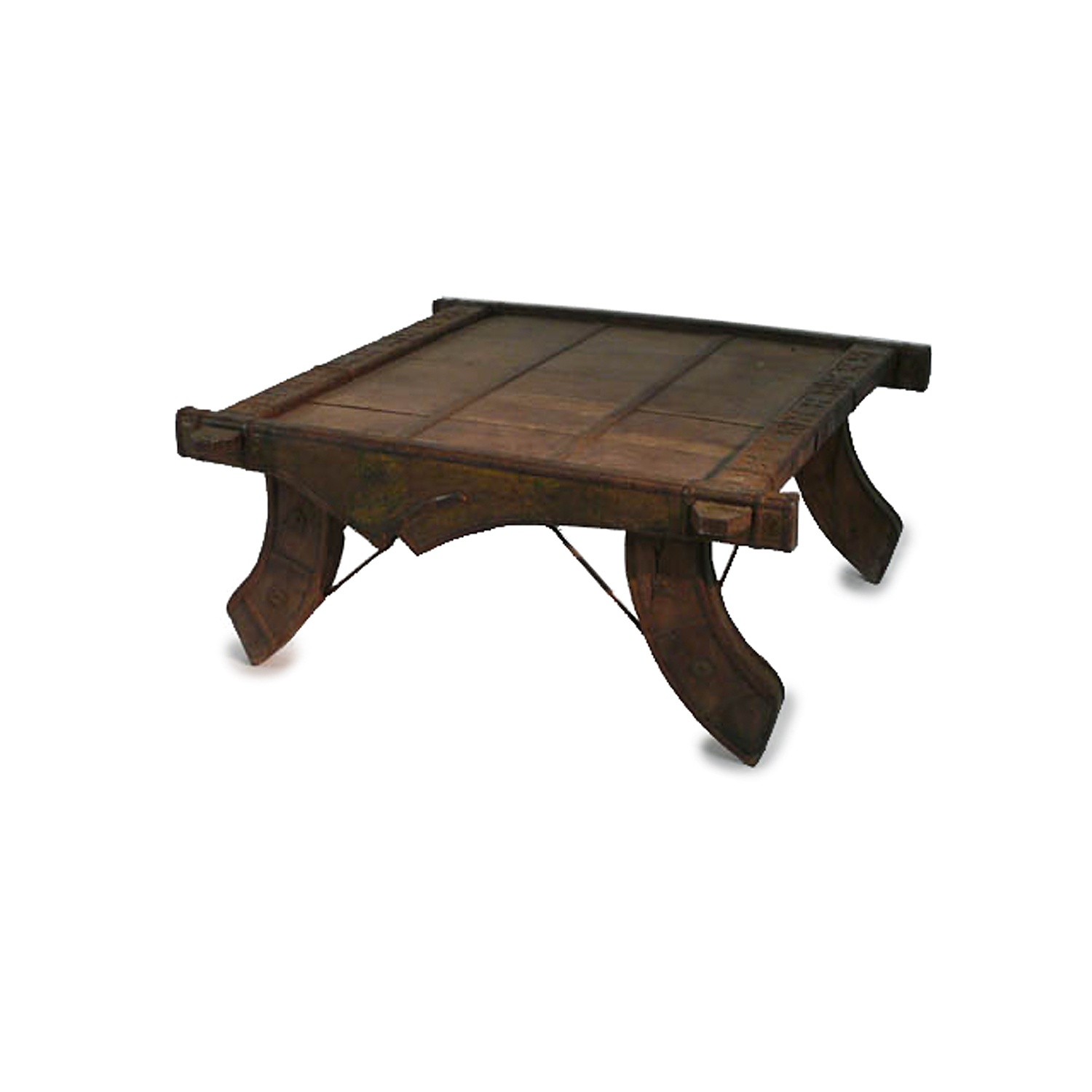 LARGE ROMAN STYLE METAL BOUND LOW TABLE WITH SPLAYED LEGS 40 CM HIGH 86 CM LONG 84 CM WIDE (X2)