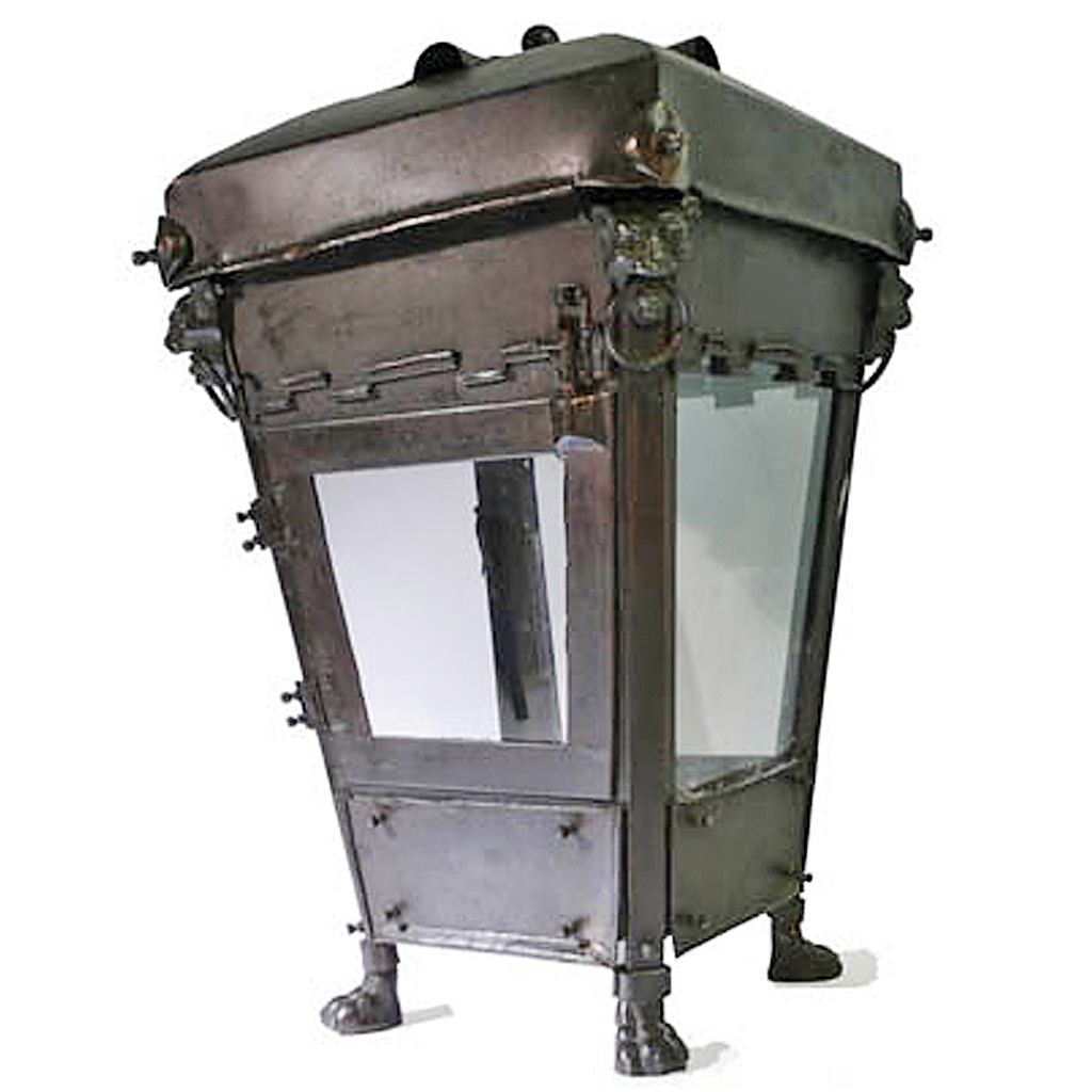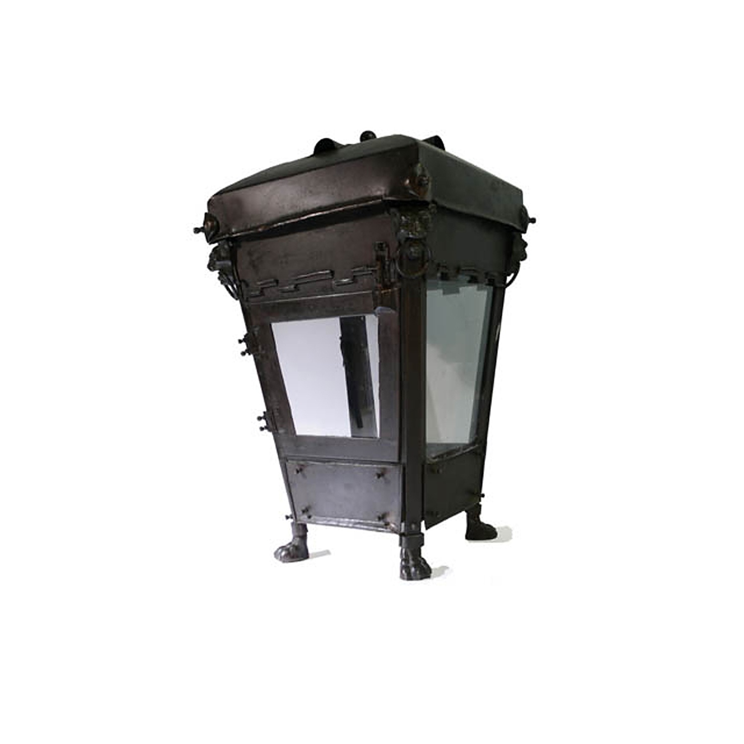 LARGE ROMAN STYLE WROUGHT IRON LANTERN WITH BRONZE LION MASK AND PAW FOOT MOUNTS 40/i HIGH 24/i WIDE (X2)