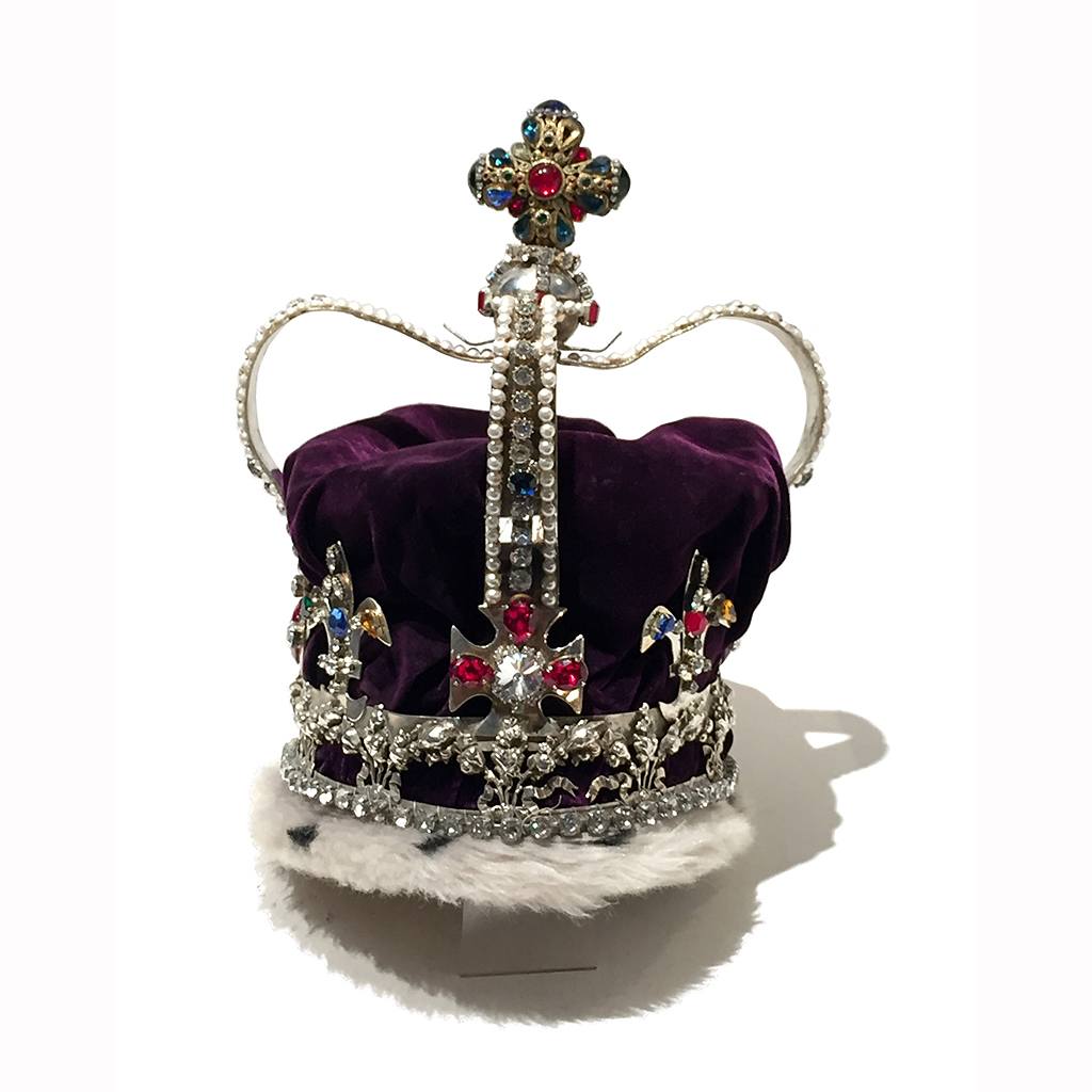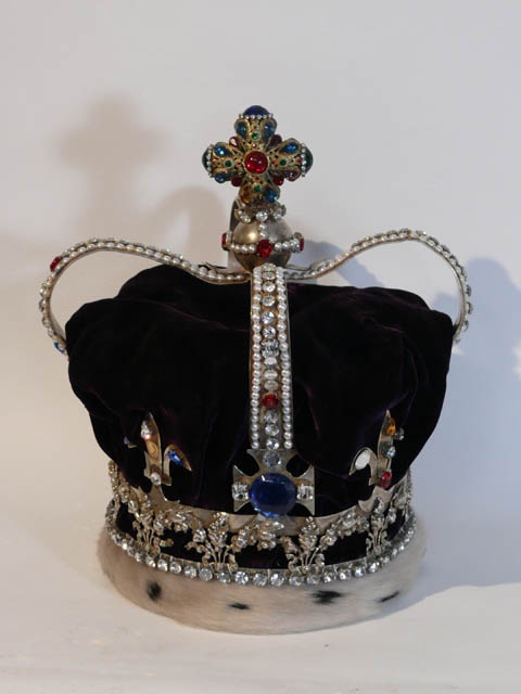 LARGE ROYAL CROWN JEWEL AND PEARL ENCRUSTED WITH PURPLE VELVET CAP