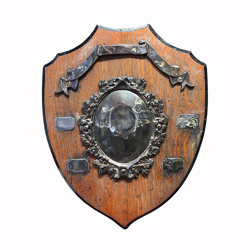 LARGE SHEFFILD SILVER SHIELD TROPHY WITH OAK BACK BOARD 50 CM HIGH 40 CM WIDE