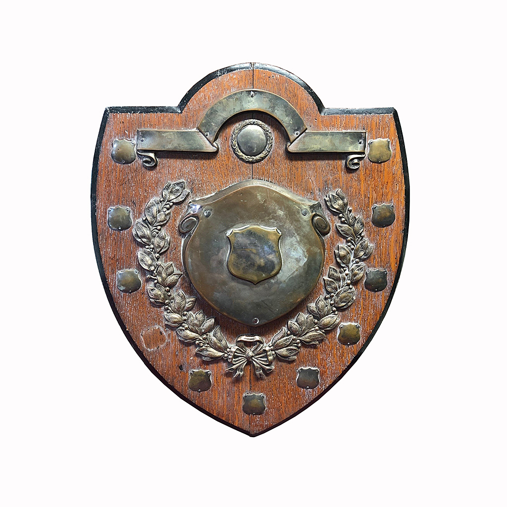LARGE SILVER TROPHY SHIELD WITH OAK BACK BOARD 43 CM HIGH 36 CM WIDE