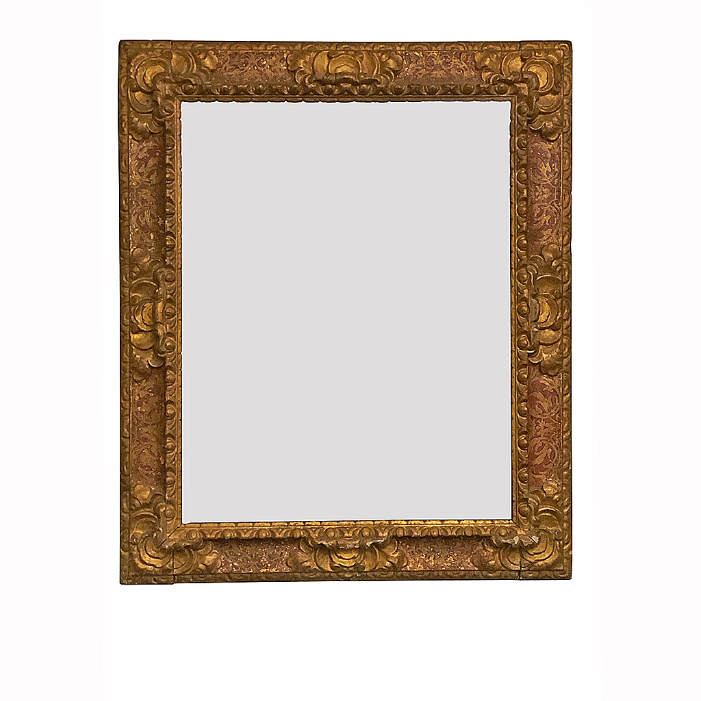 LARGE SPANISH MIRROR CARVED ROUGE DECORATED AND GILDED BOLECTION FRAME CIRCA 1650 132 CM HIGH 111 CM WIDE