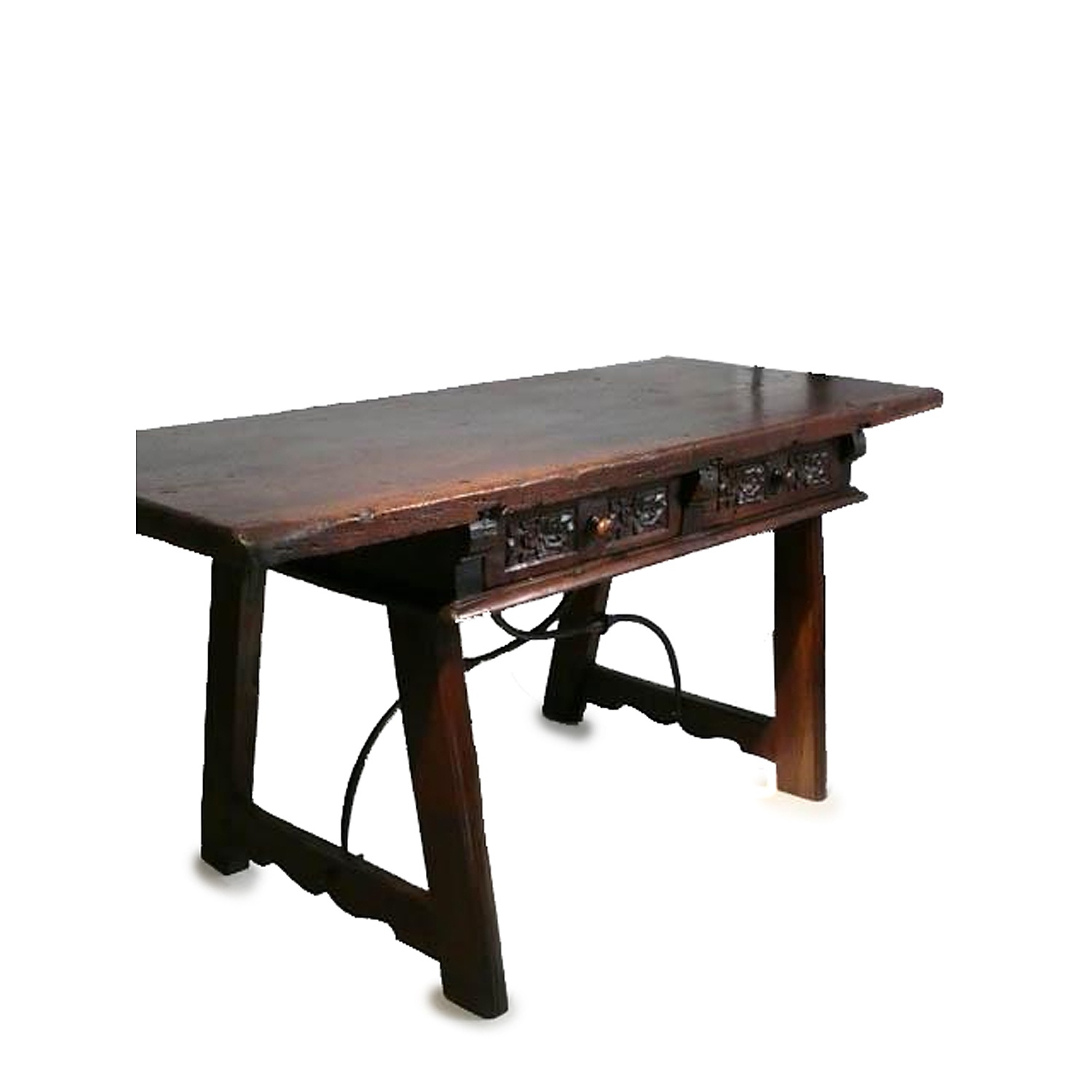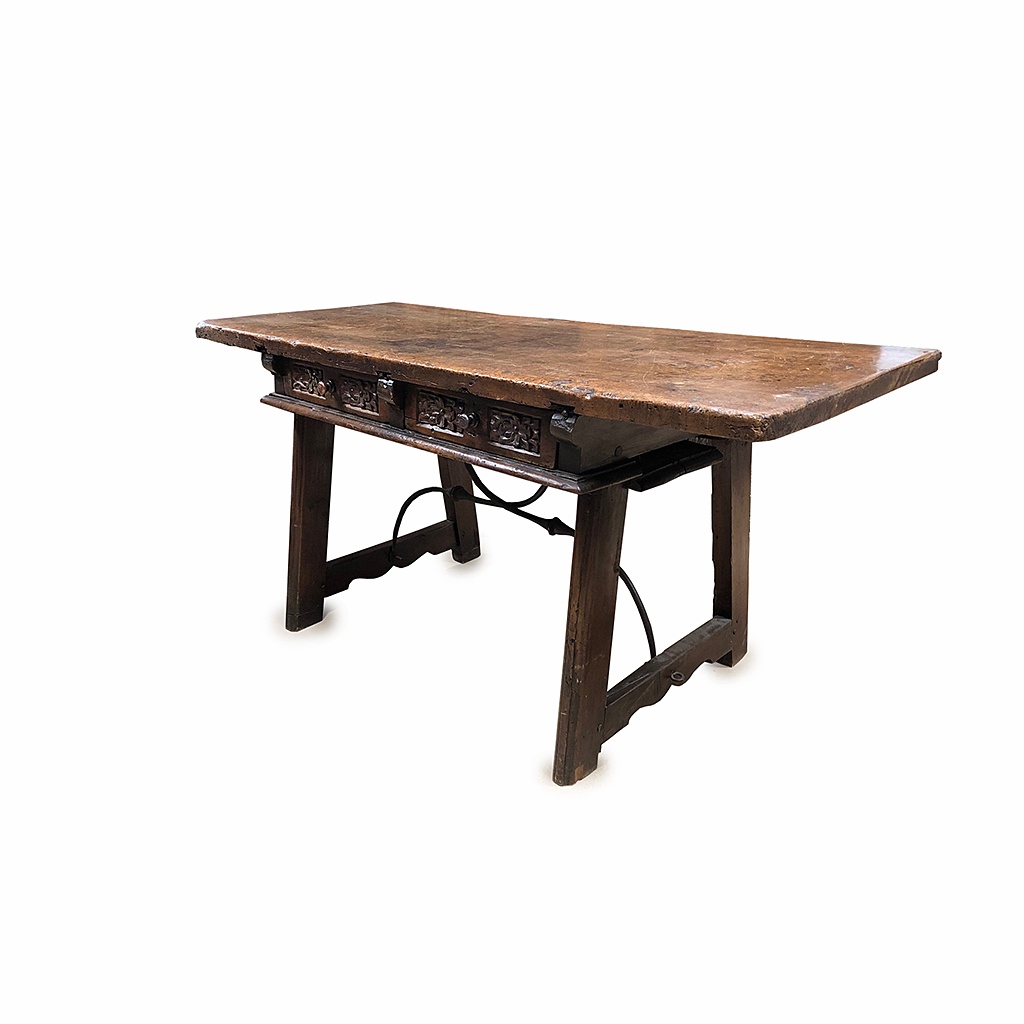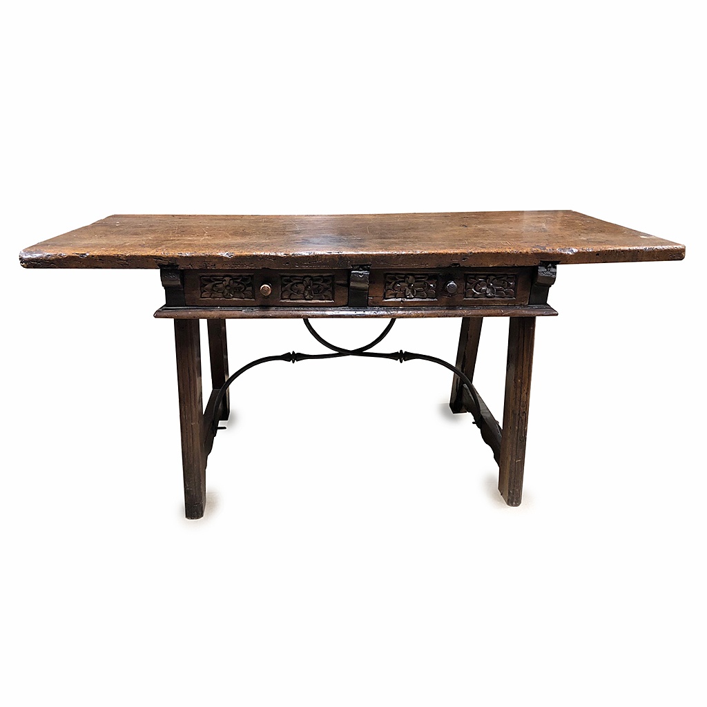 LARGE SPANISH TABLE CHESTNUT TOP WITH TWO CHIP CARVED DRAWERS 17TH CENT. 76 CM HIGH 161 CM WIDE 65 CM DEEP