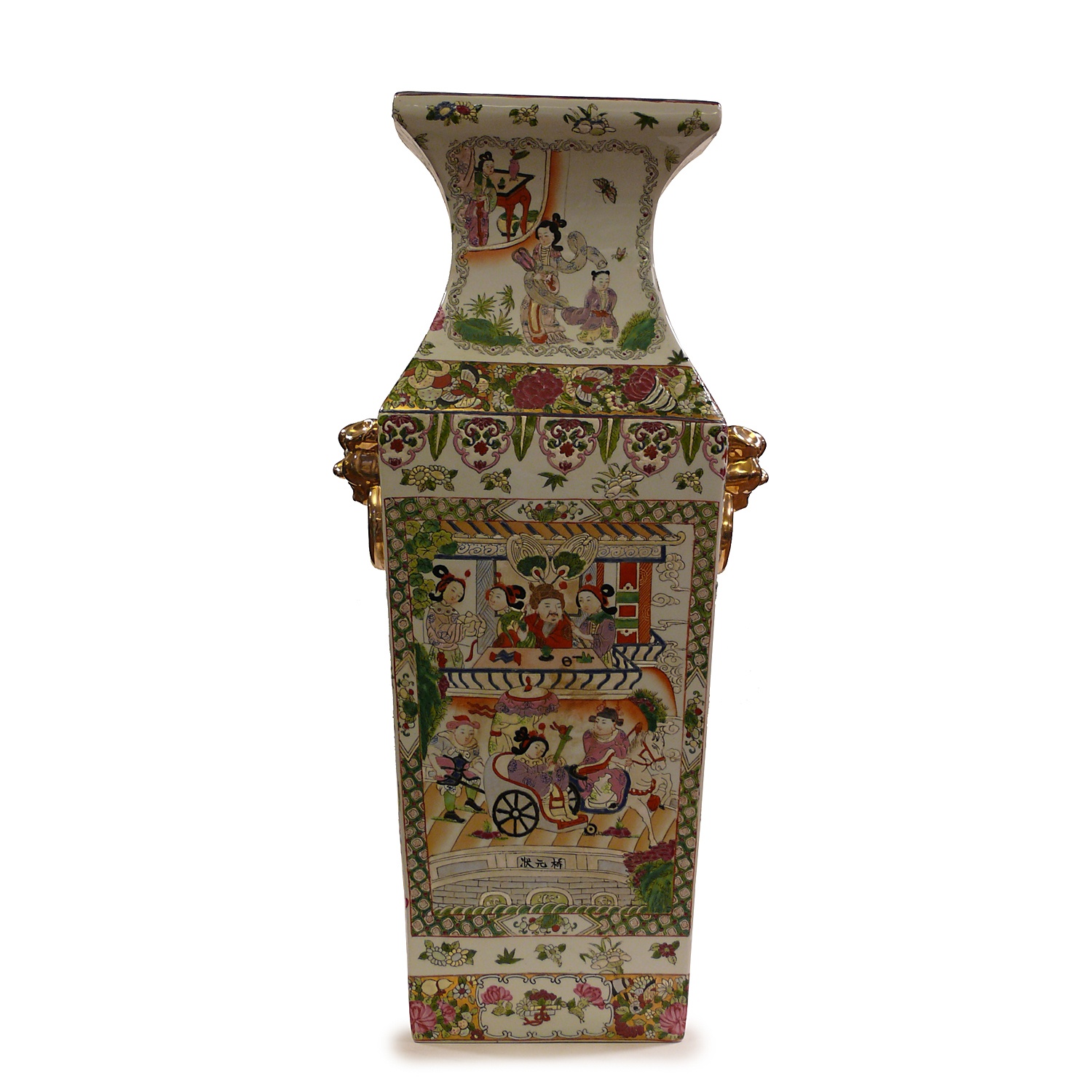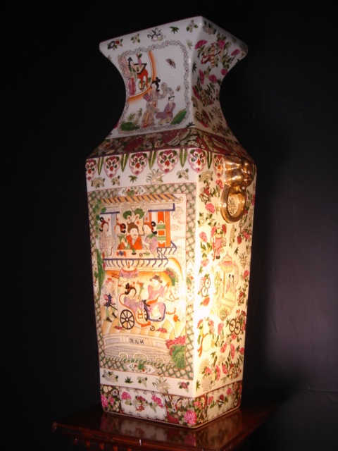 LARGE SQUARE CHINESE FAMILLE VERT VASE WITH GILT GLAZED RING HANDLES 24/i HIGH (X2)
