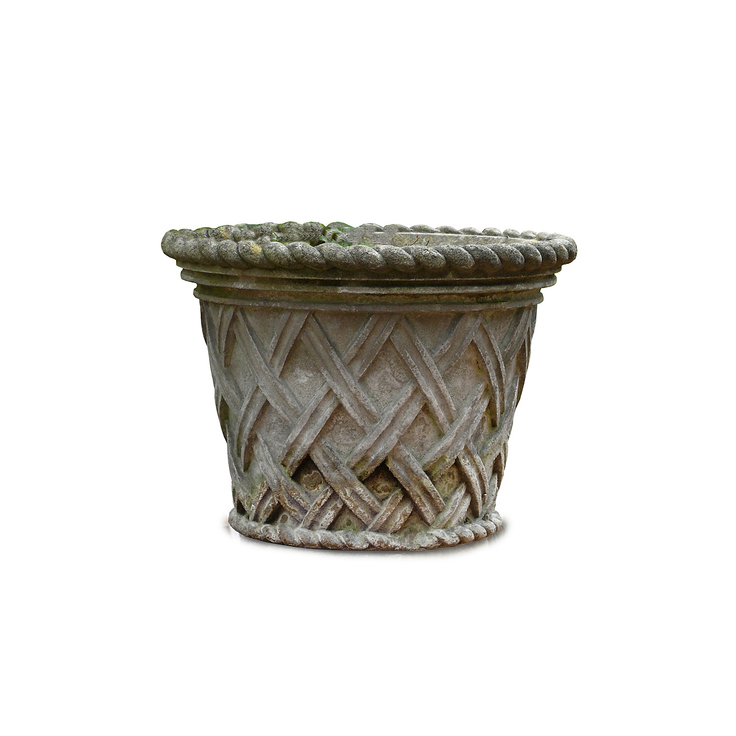LARGE STONE BASKET WEAVE GARDEN URN / TUB 41 CM HIGH 53 CM DIAM (X2)