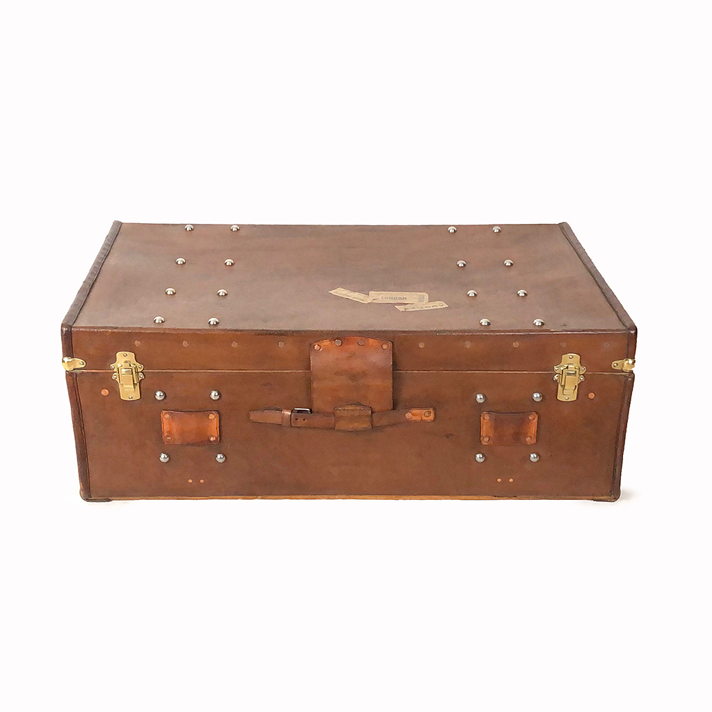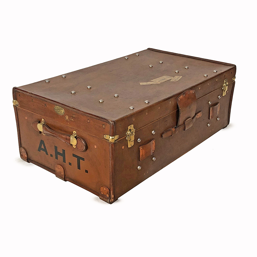 LARGE TAN TRAVEL TRUNK COMPRESSED CANE WITH LEATHER TRIM MAKERS LABEL FEATHERLIGHT REG. 33 CM HIGH 93 CM WIDE 55 CM DEEP