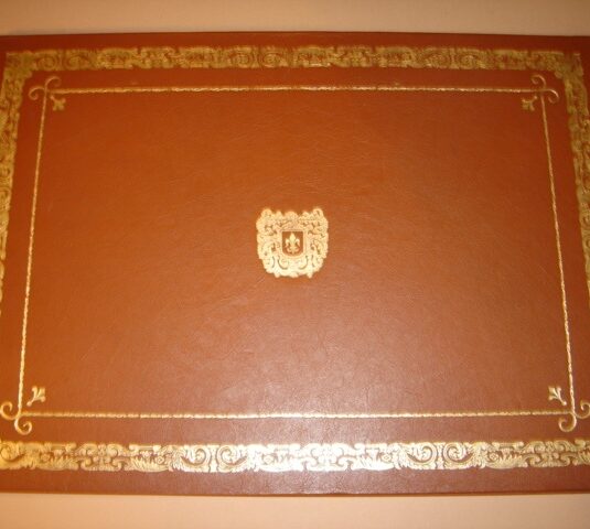 LARGE TOOLED TAN LEATHER DESK BLOTTER WITH GOLD CREST (X12)