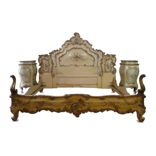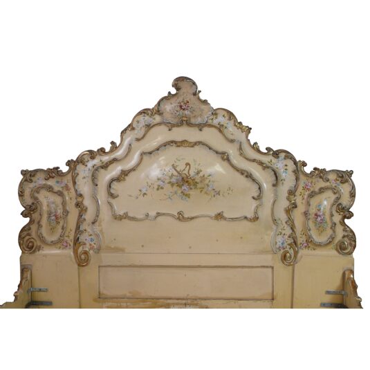 LARGE VENETIAN DOUBLE BED CARVED CREAM LACQUER POLYCHROME AND PARCEL GILT MID 20TH CENT 6'3/i X 6'3/i MATTRESS SIZE