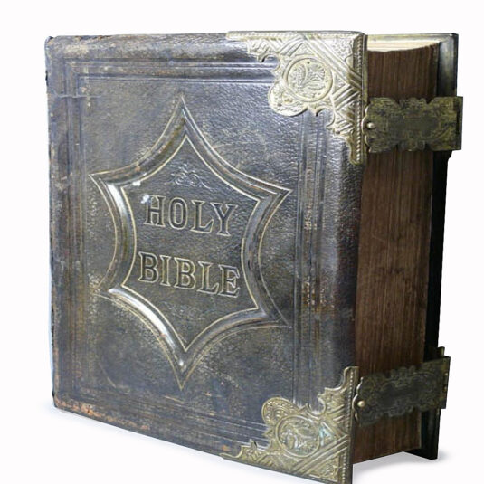LARGE VICTORIAN BRASS BOUND TOOLED BLACK LEATHER CHURCH BIBLE