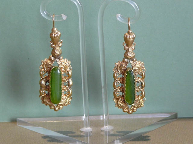 LARGE VICTORIAN PINCHBECK EARRINGS WITH JADE CENTRES