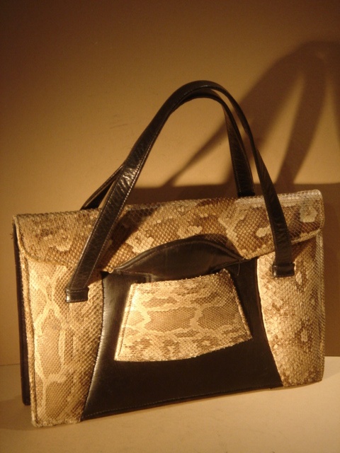 LARGE VINTAGE BLACK LEATHER AND SNAKESKIN HANDBAG 28 CM WIDE