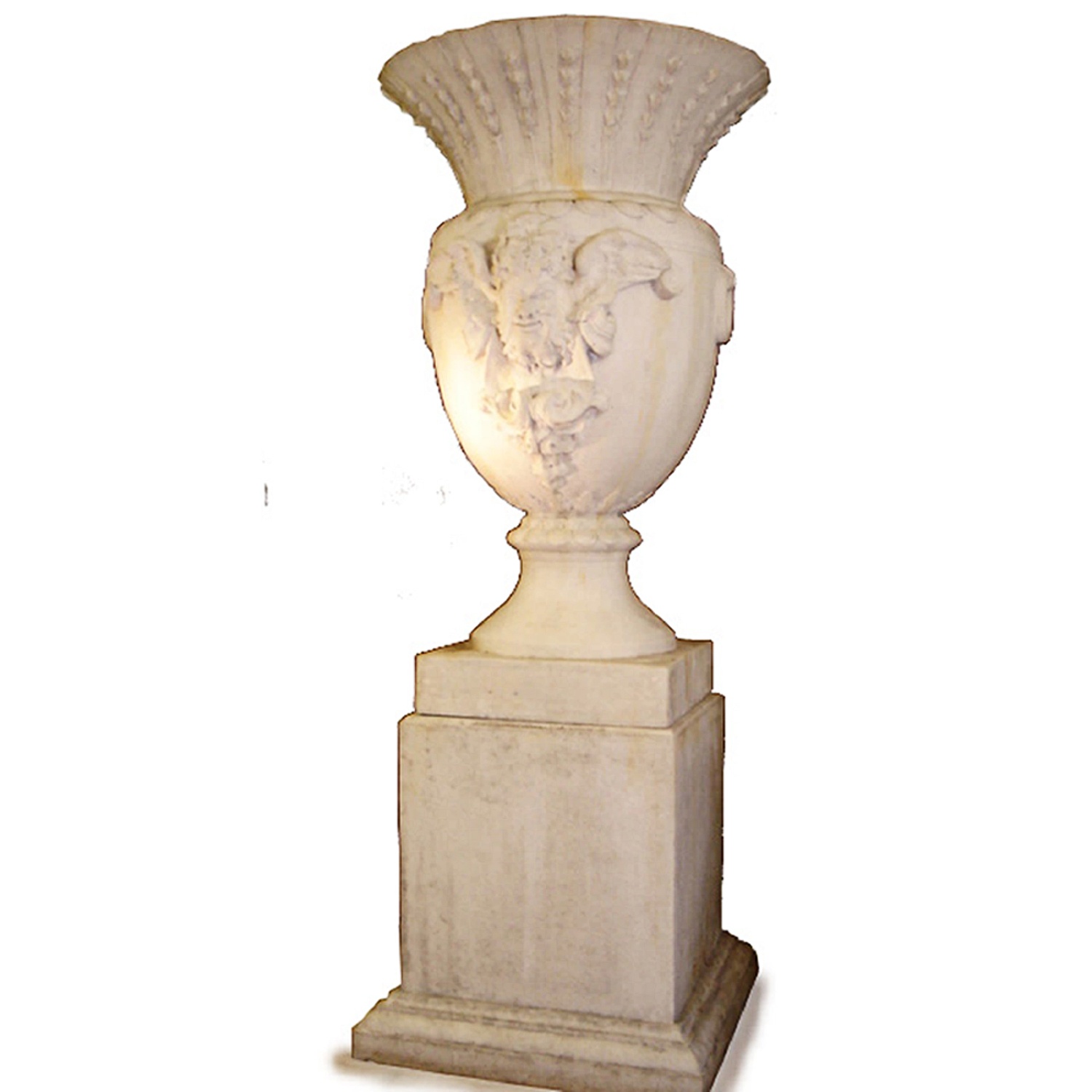 LARGE WHITE STONE FRENCH GARDEN URN IN THREE PARTS WITH MASK SIDES 6'6/i HIGH 198 CM (X6)