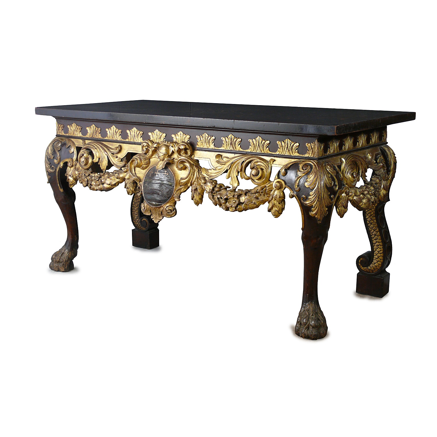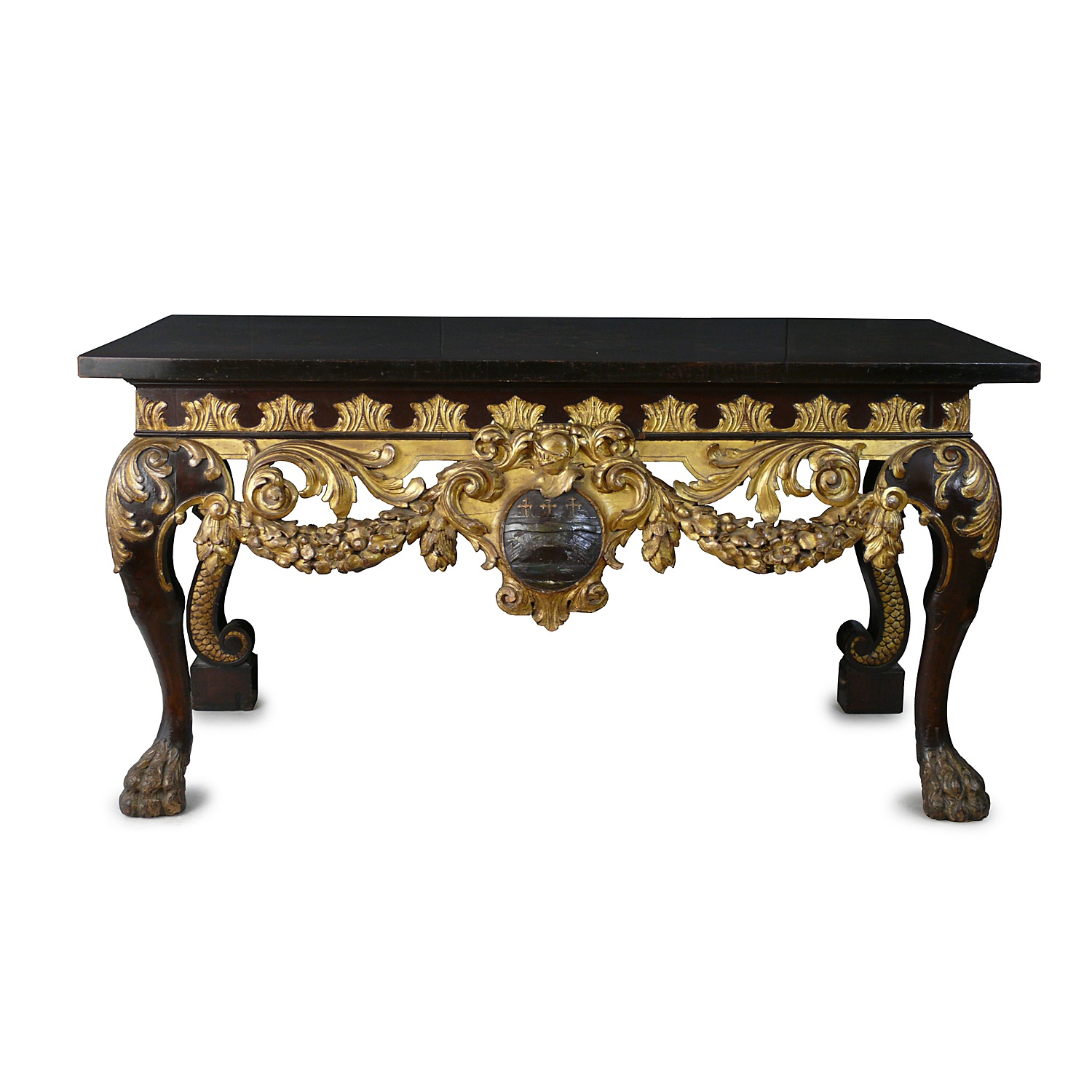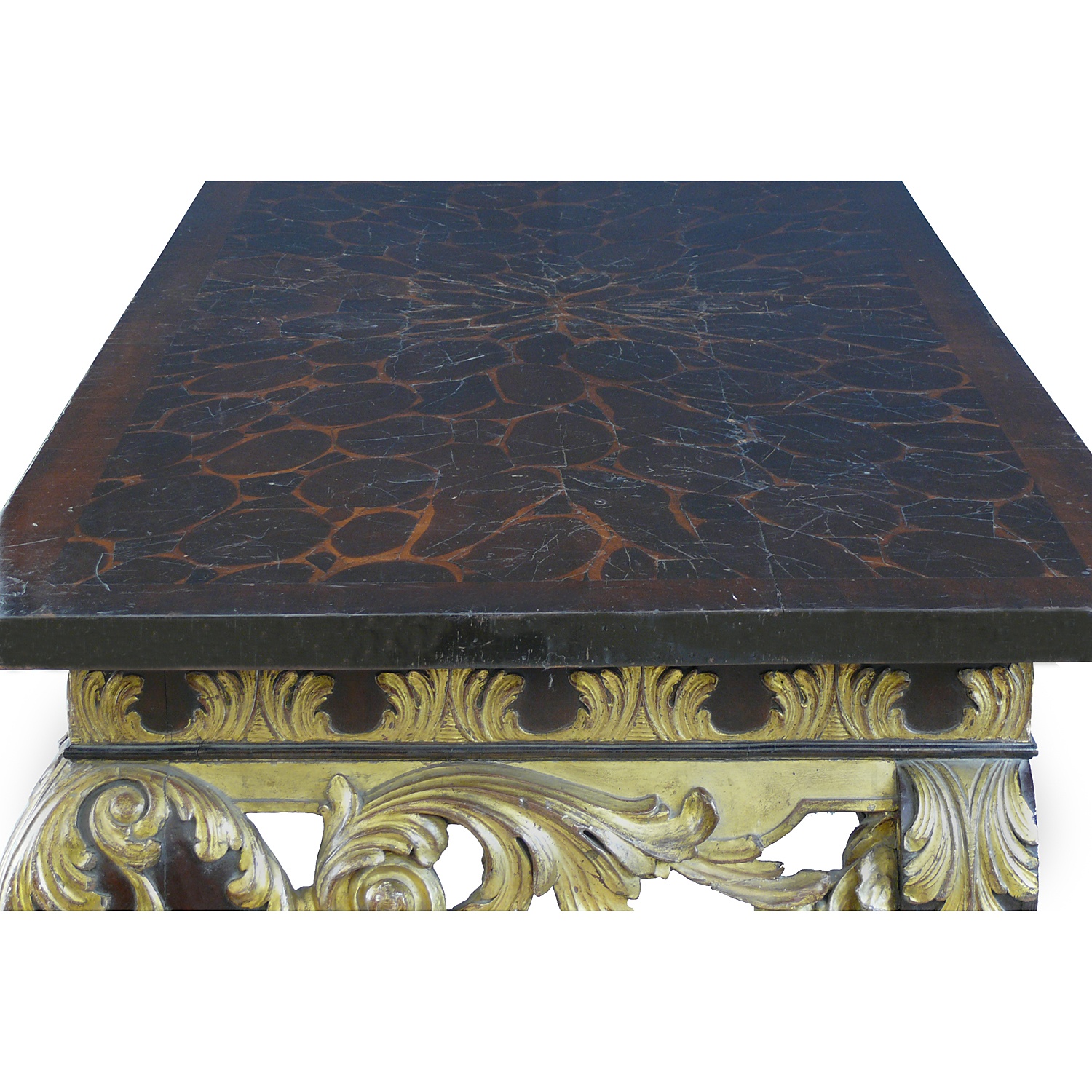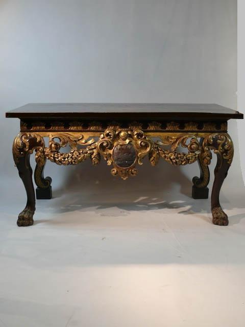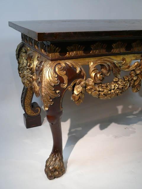 LARGE WILLIAM KENT CARVED AND PARCEL GILDED CONSOLE TABLE WITH OYSTER VENEER TOP 91 CM HIGH 183 CM WIDE 89 CM DEEP (X2)