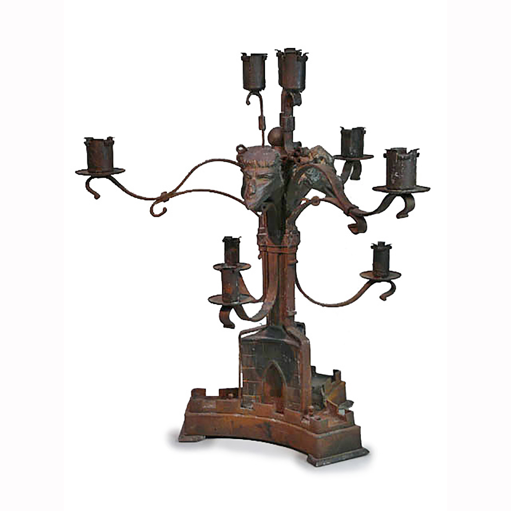 LARGE WROUGHT IRON AND BRONZE GRIFFIN CANDELABRA WITH CENTRAL KEEP TRI CORNER BASE NINE LIGHT 3' HIGH 91 CM 26 KG (X4)