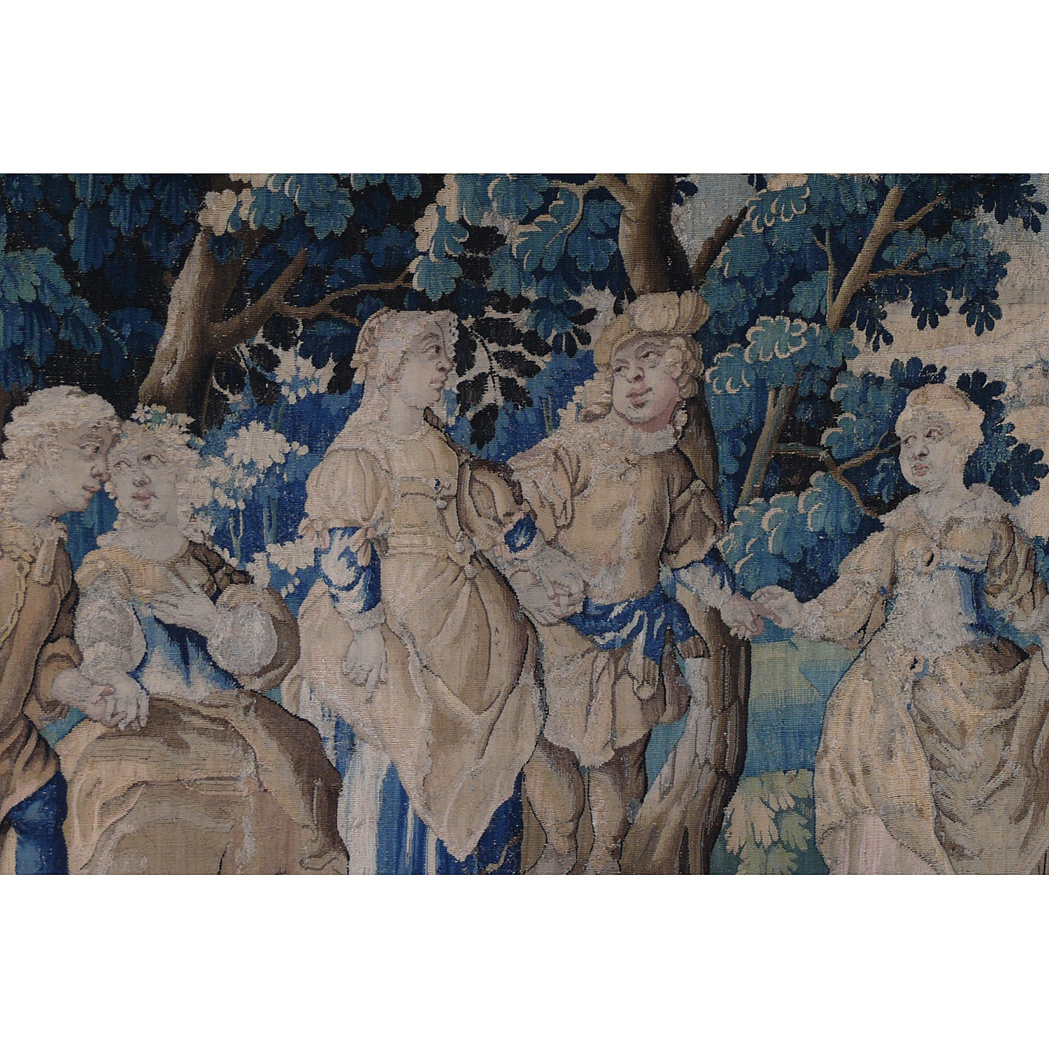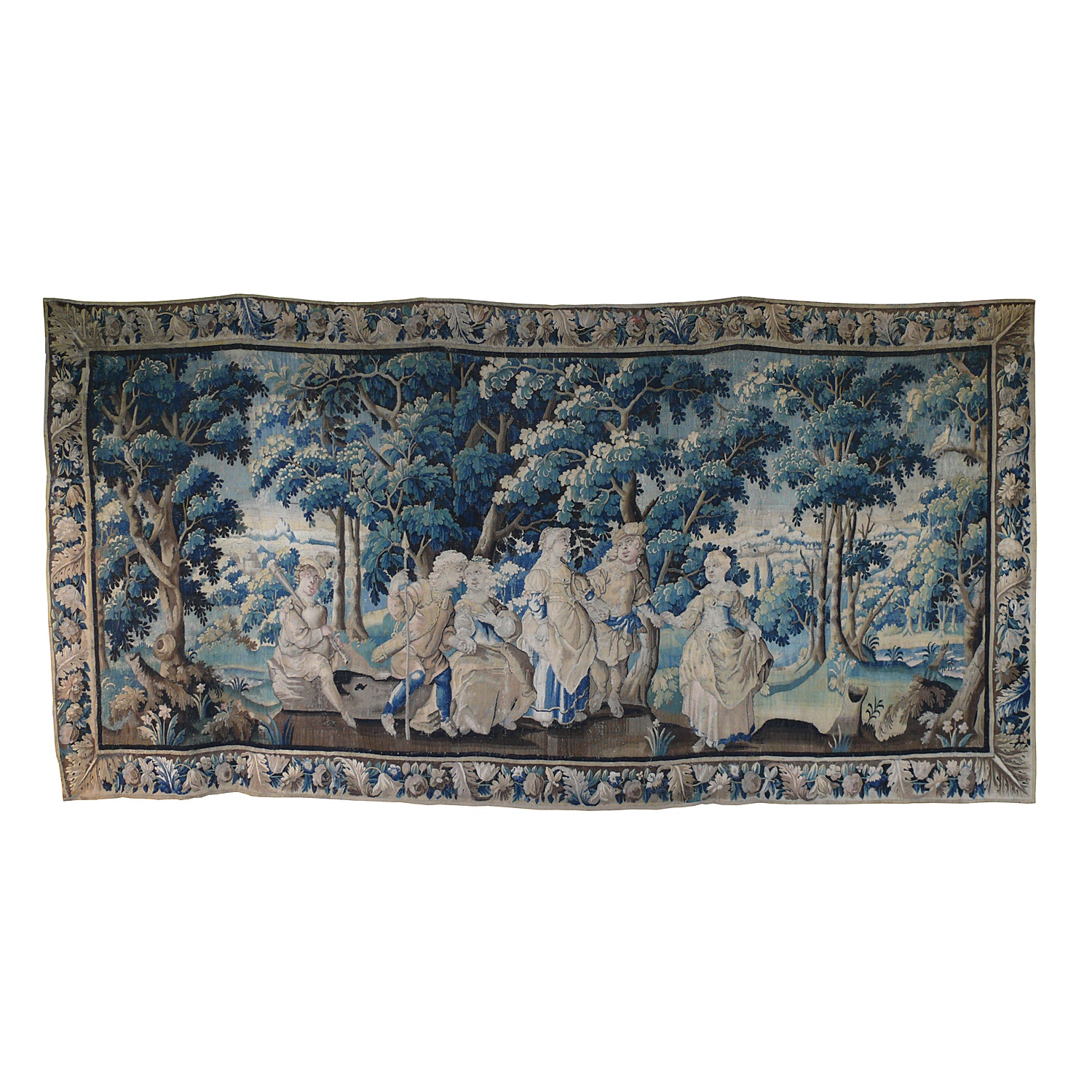 LATE 17TH CENT AUBUSSON VERDURE TAPESTRY A GROUP OF FIGURES IN A WOODLAND SCENE WITH FLORAL BORDER 224 CM HIGH 451 CM WIDE
