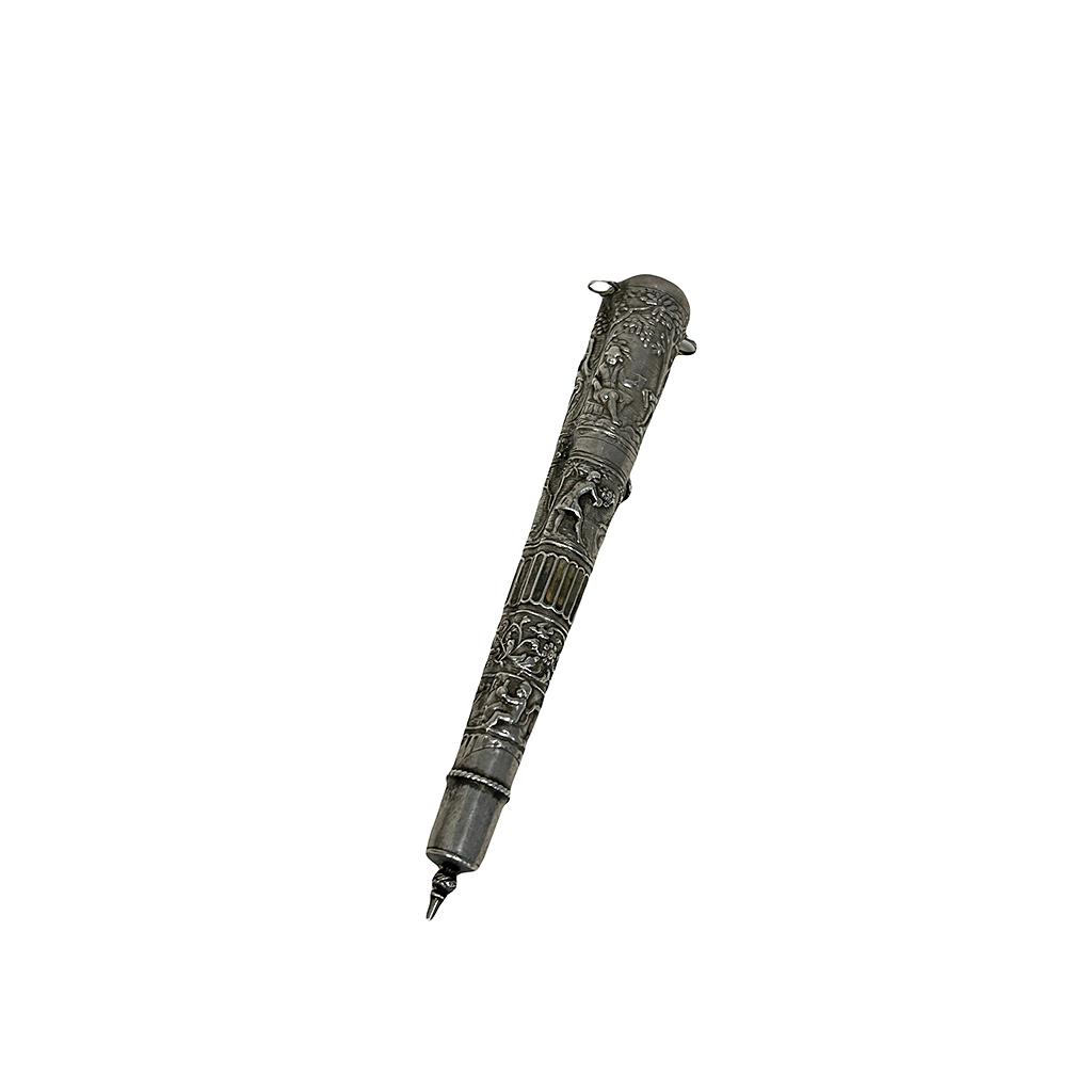 LATE 18TH CENTURY SILVER CHATELAINE NEEDLE / PEN HOLDER WITH ORNATE RELIEF OF FIGURES CONICAL TUBULAR SHAPE 16 CM HIGH