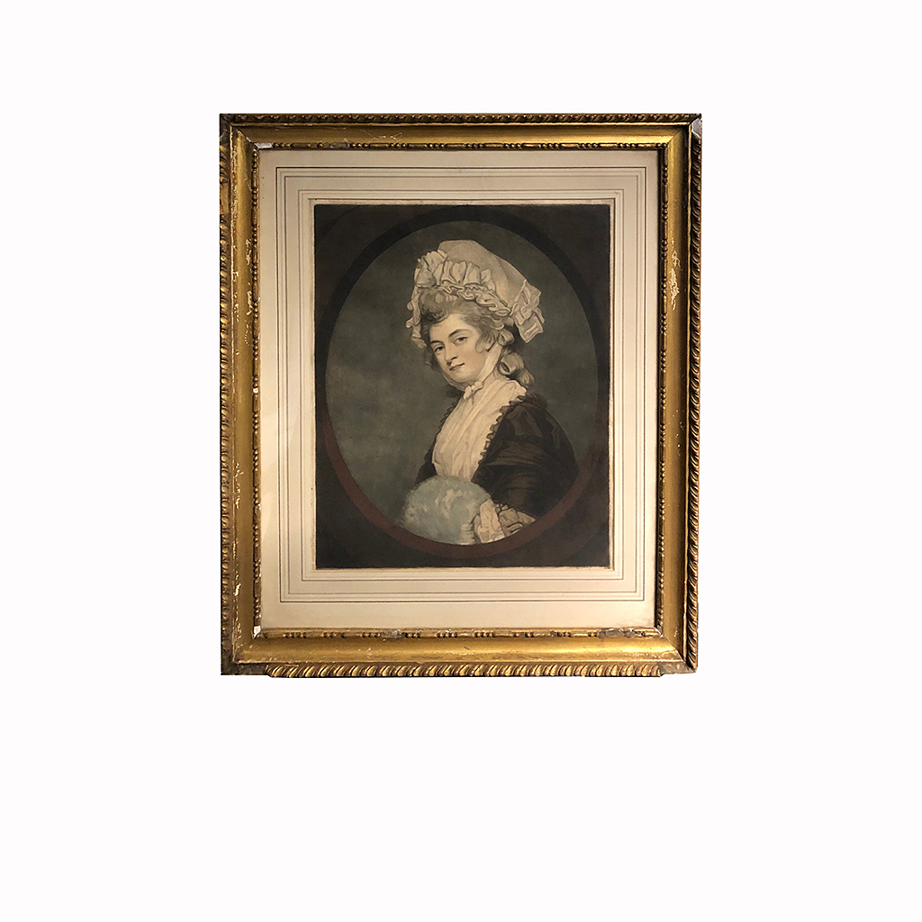 LATE 18THC PRINT PORTRAIT OF A LADY WEARING A BONNET IN A GILT FRAME WITH FEIGNED OVAL IN A LINED MOUNT