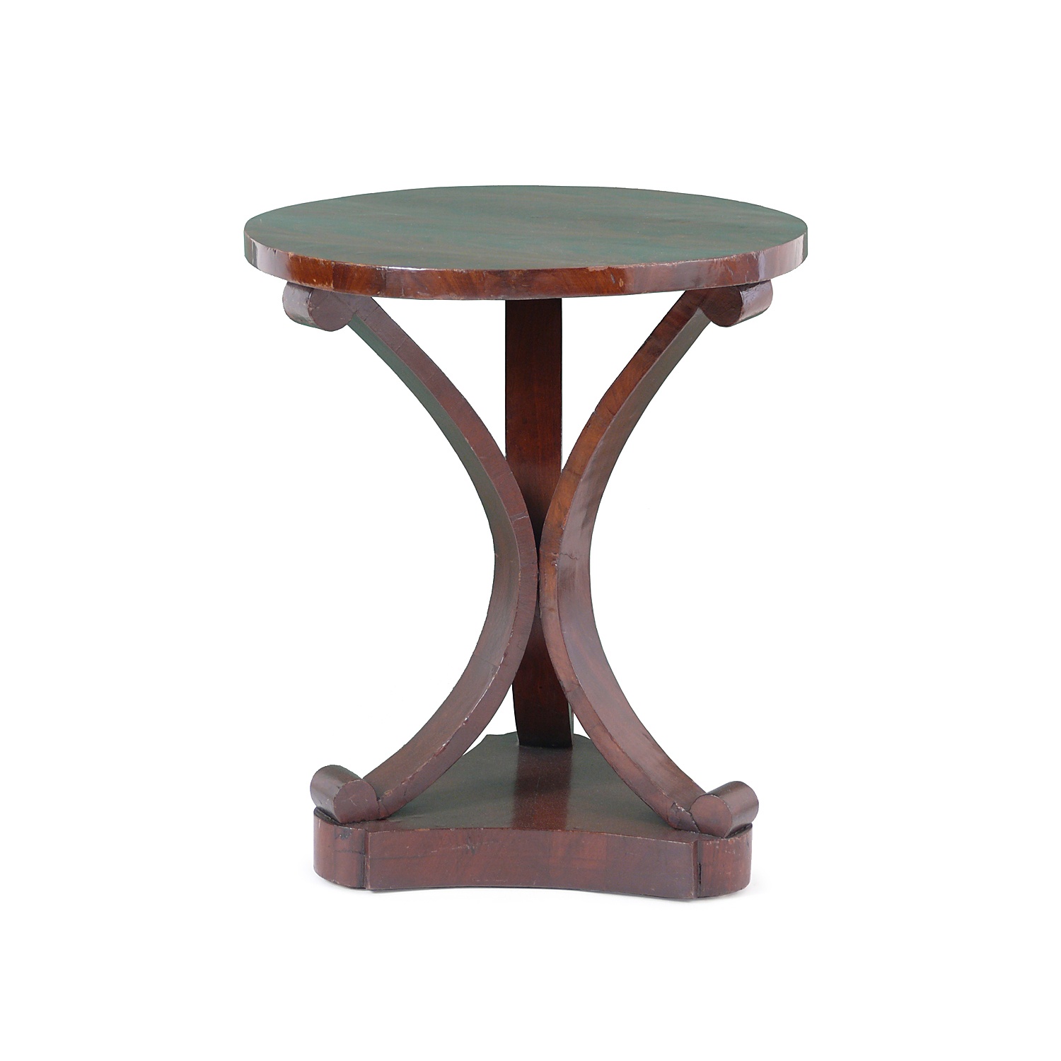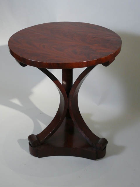LATE REGENCY CIRCULAR MAHOGANY WINE TABLE WITH TRI SABRE LEG SUPPORT 51 CM HIGH 44 CM DIAM