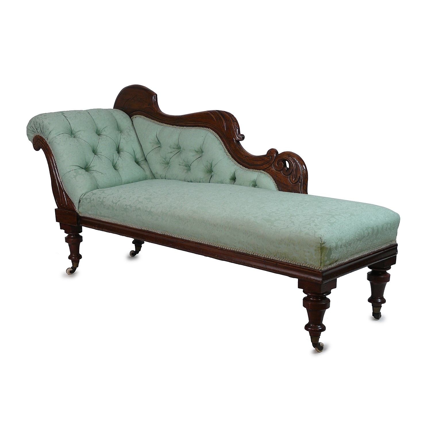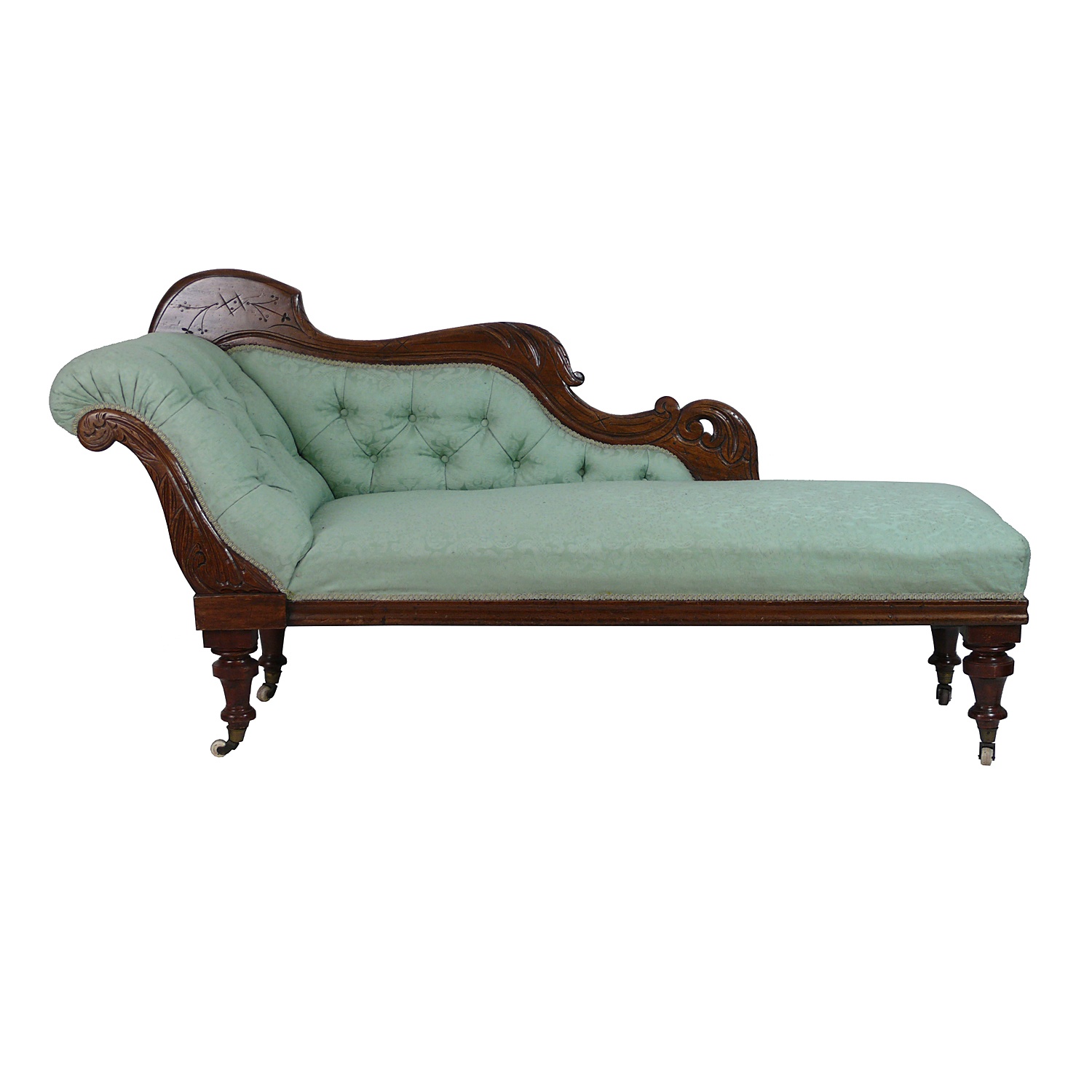 LATE VICTORIAN CHAISE LONGUE CARVED MAHOGANY WITH PALE GREEN UPHOLSTERY DEEP BUTTONED REST 95 CM HIGH 189 CM LONG 58 CM DEEP
