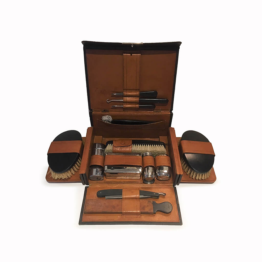 LEATHER BOXED THIRTEEN PIECE EBONY AND CHROME MEN'S TOILET SET WITH BRUSHES AND SHAVING ITEMS - 13 PIECES