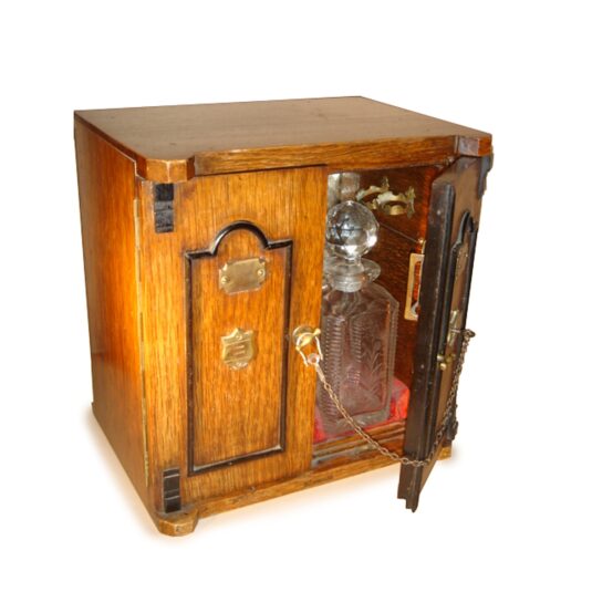 LIGHT OAK AND EBONY TANTALUS BOX IN FORM OF SAFE WITH CONTENTS