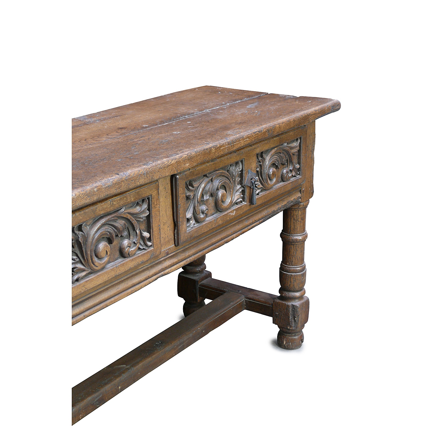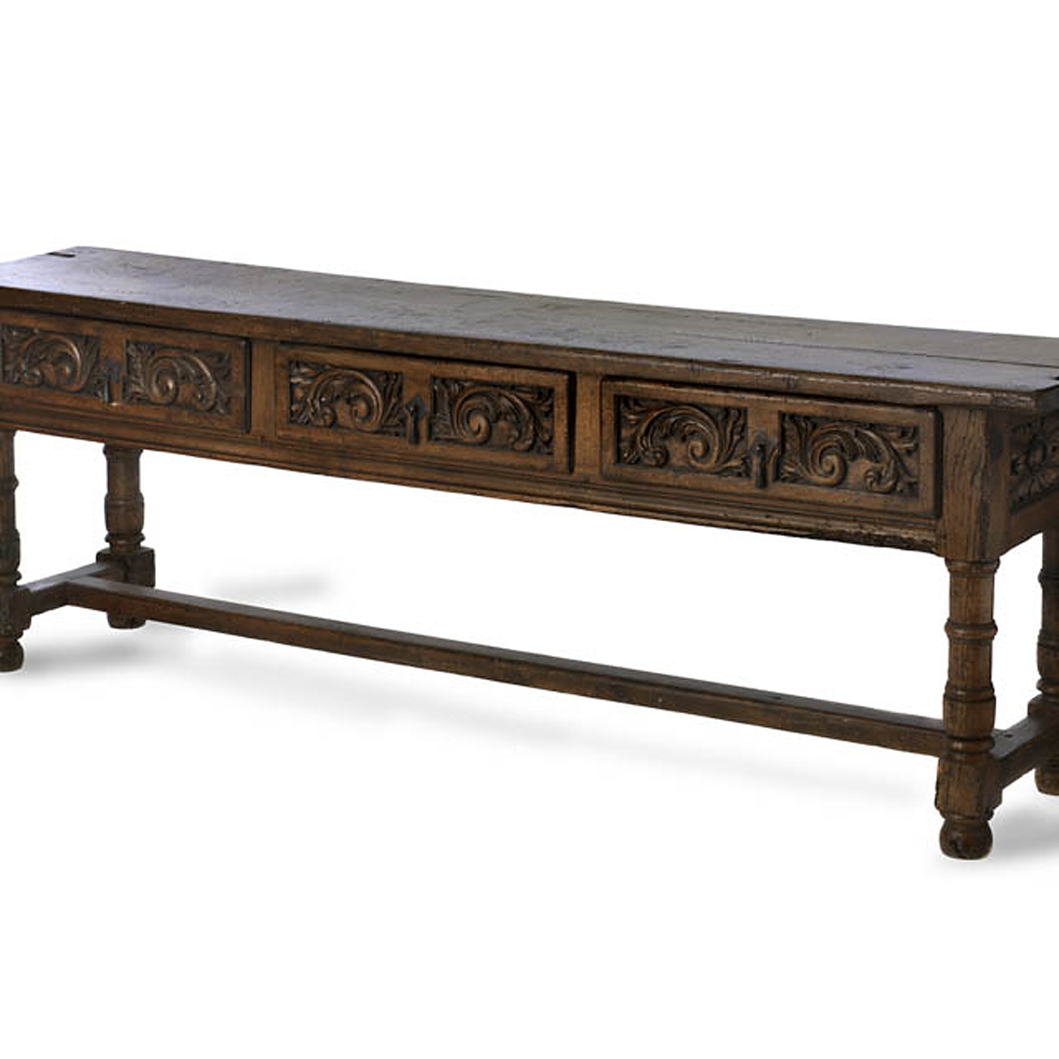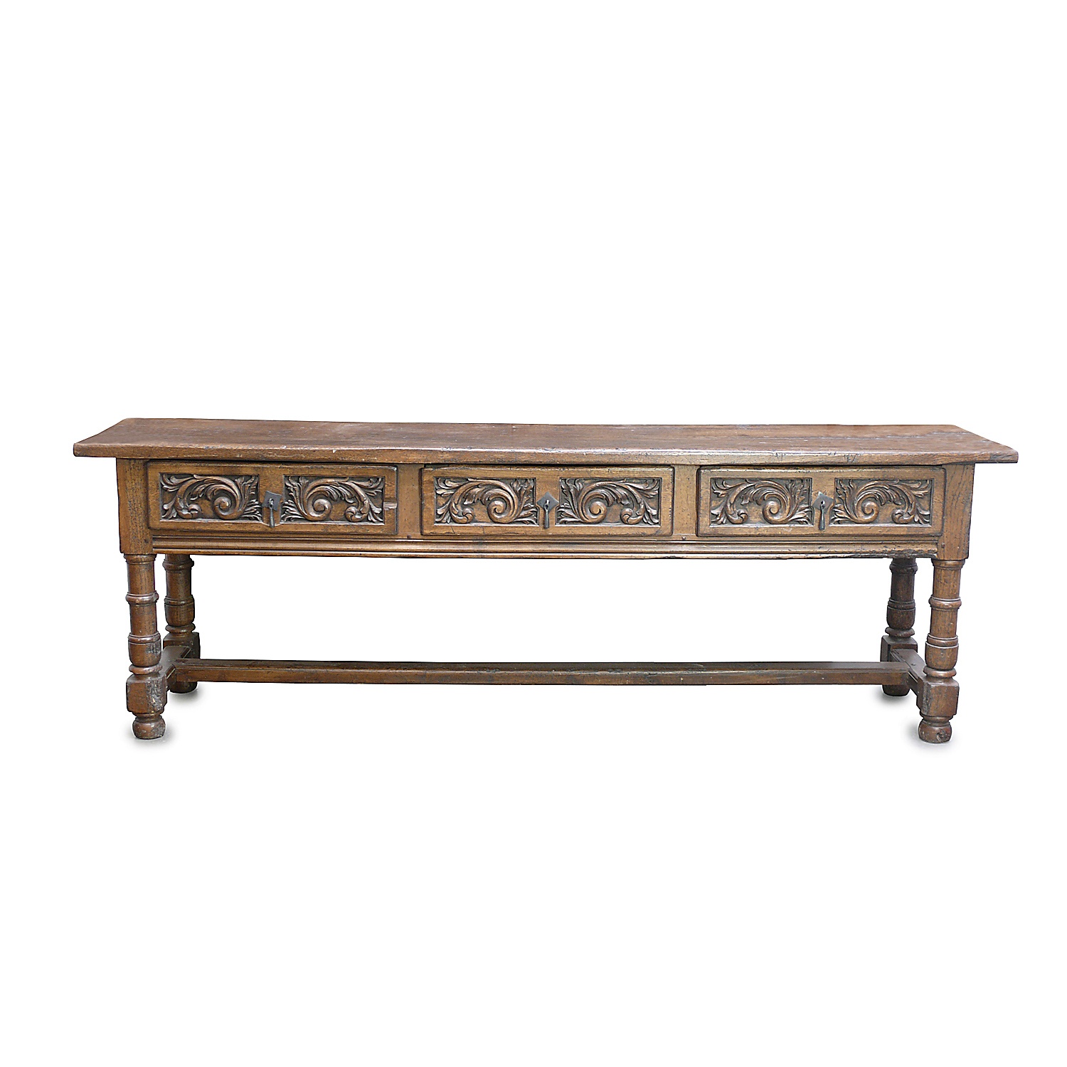 LONG SPANISH CARVED OAK SIDE BOARD / TABLE WITH THREE ORNATE DRAWERS 250 CM LONG 84 CM HIGH 55 CM DEEP