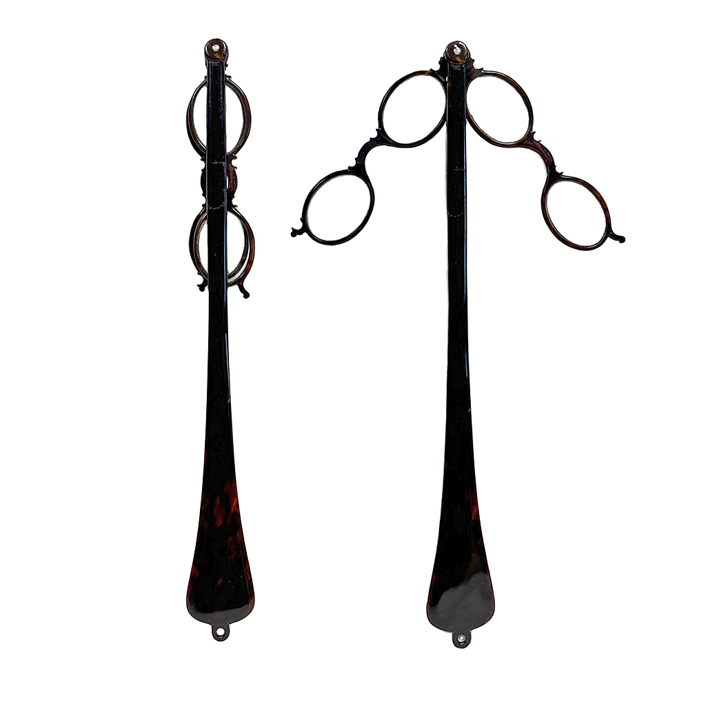 LONG TORTOISESHELL FOLDING LORGNETTES WITH TWO PAIRS OF SPECTACLES 28 CM LONG