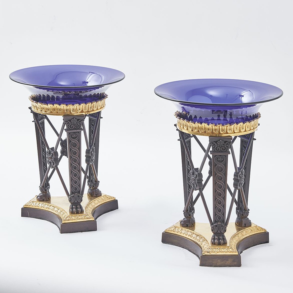 LOUIS PHILIPPE ANTHENIENNE / TAZZA BRONZE AND ORMOLU WITH COBOLT BLUE GLASS BOWL CIRCA 1850 30 CM HIGH 23 CM DIAM (X2)