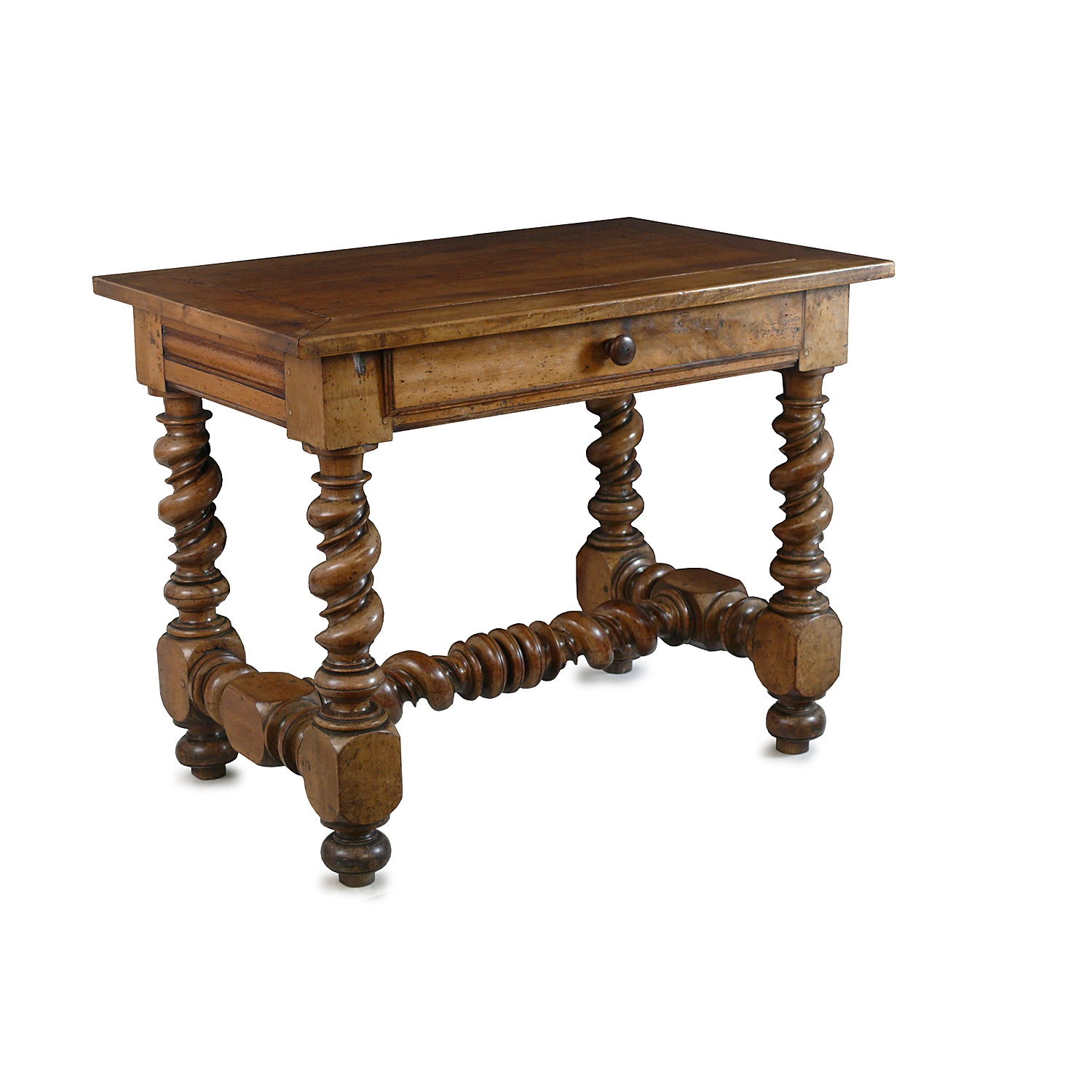 LOUIS XIII LIGHT FRUITWOOD TABLE WITH SINGLE DRAWER AND ORNATE TURNED LEGS AND STRETCHER 81 CM 103 CM WIDE 68 CM DEEP