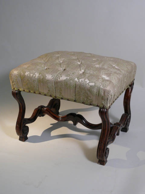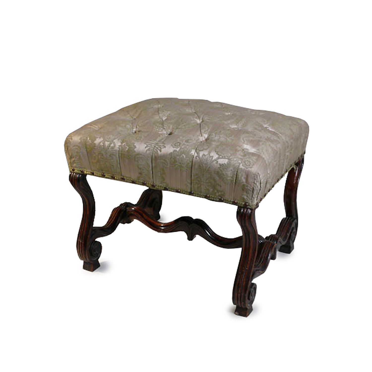 LOUIS XIV STYLE WALNUT STOOL DEEP BUTTONED CREAM / GREEN DAMASK UPHOLSTERY