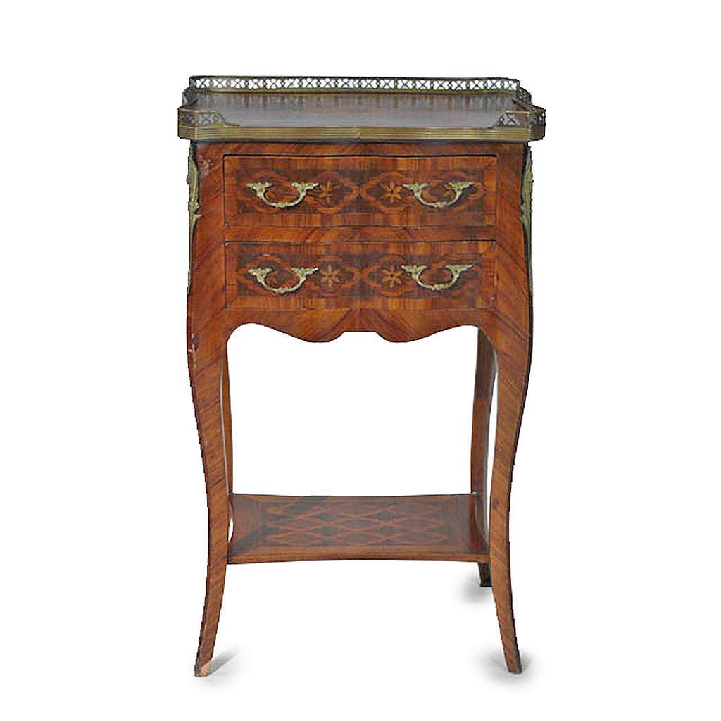 LOUIS XV STYLE BEDSIDE TABLE TWO TONE MARQUETRY WITH TWO DRAWERS AND GALLERY EDGE 43 CM LONG 32 CM WIDE 71 CM HIGH (X2)