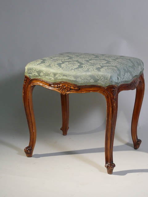 LOUIS XV CARVED BEECHWOOD STOOL PALE DAMASK UPHOLSTERY
