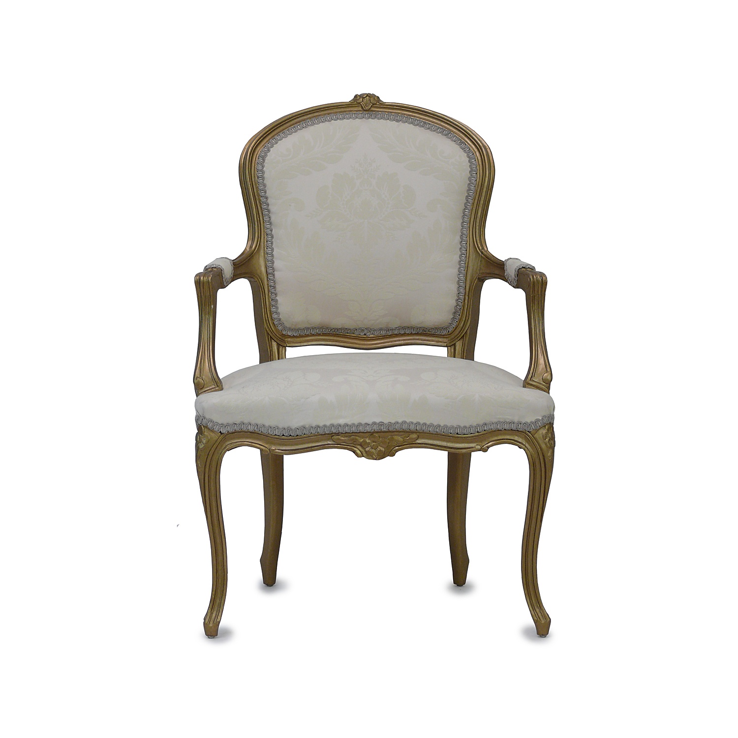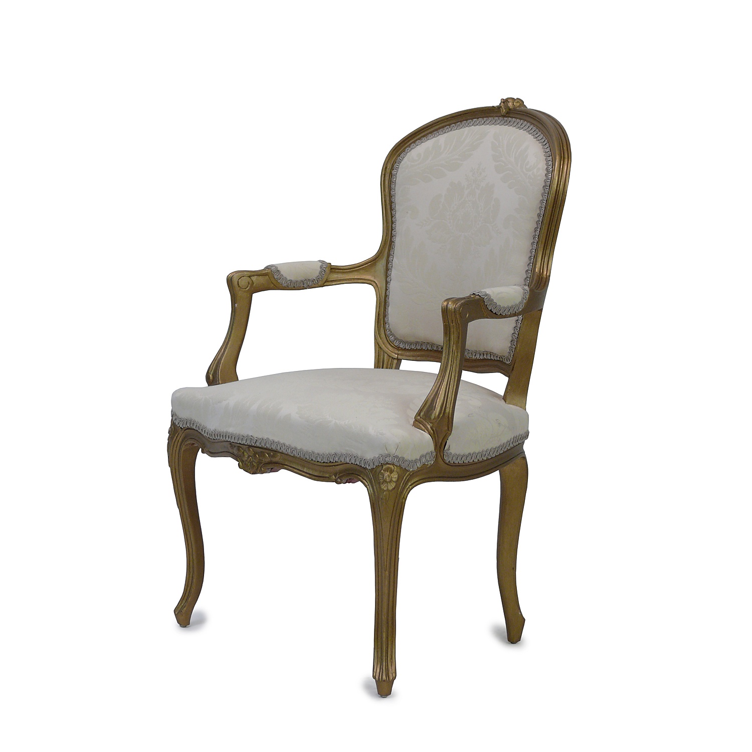 LOUIS XV GILTWOOD OPEN ELBOW CHAIR LOW SEAT HEIGHT PALE CREAM DAMASK UPHOLSTERY 90 CM HIGH 60 CM WIDE 46 CM DEEP (X2)