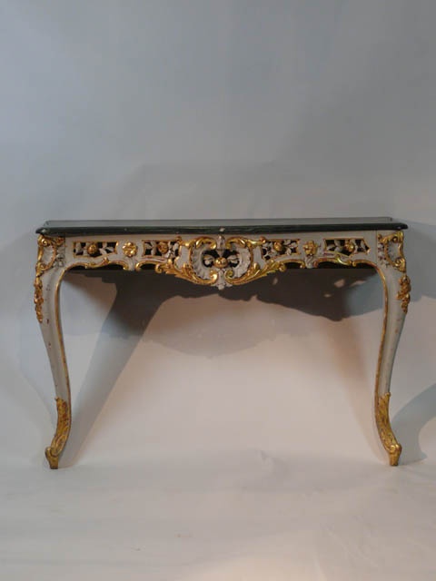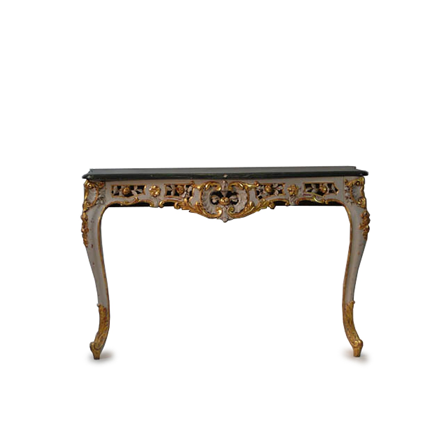 LOUIS XV GREY AND GILDED CONSOLE TABLE WITH GREEN FAUX MARBLE TOP ) 47/i LONG 31/i HIGH 17/i DEEP (X2)