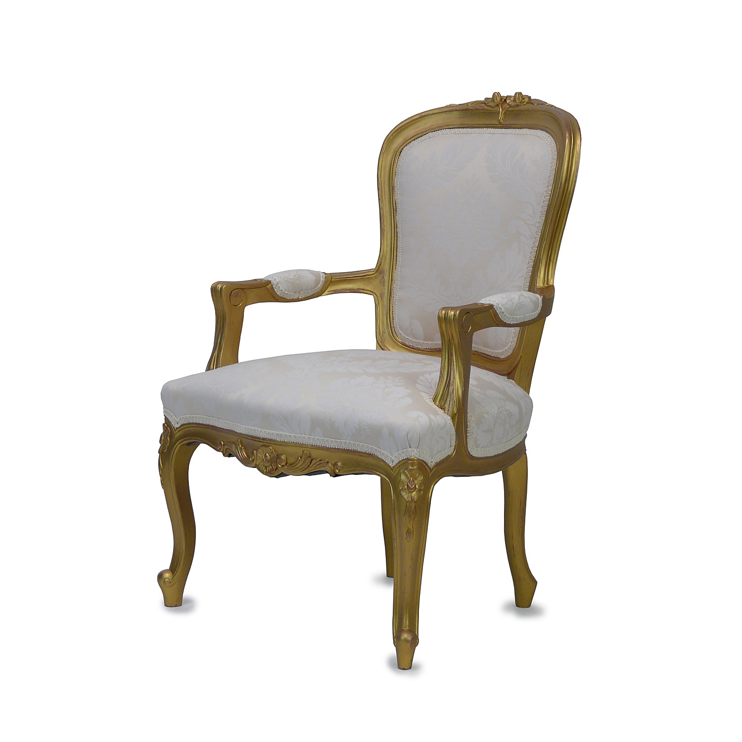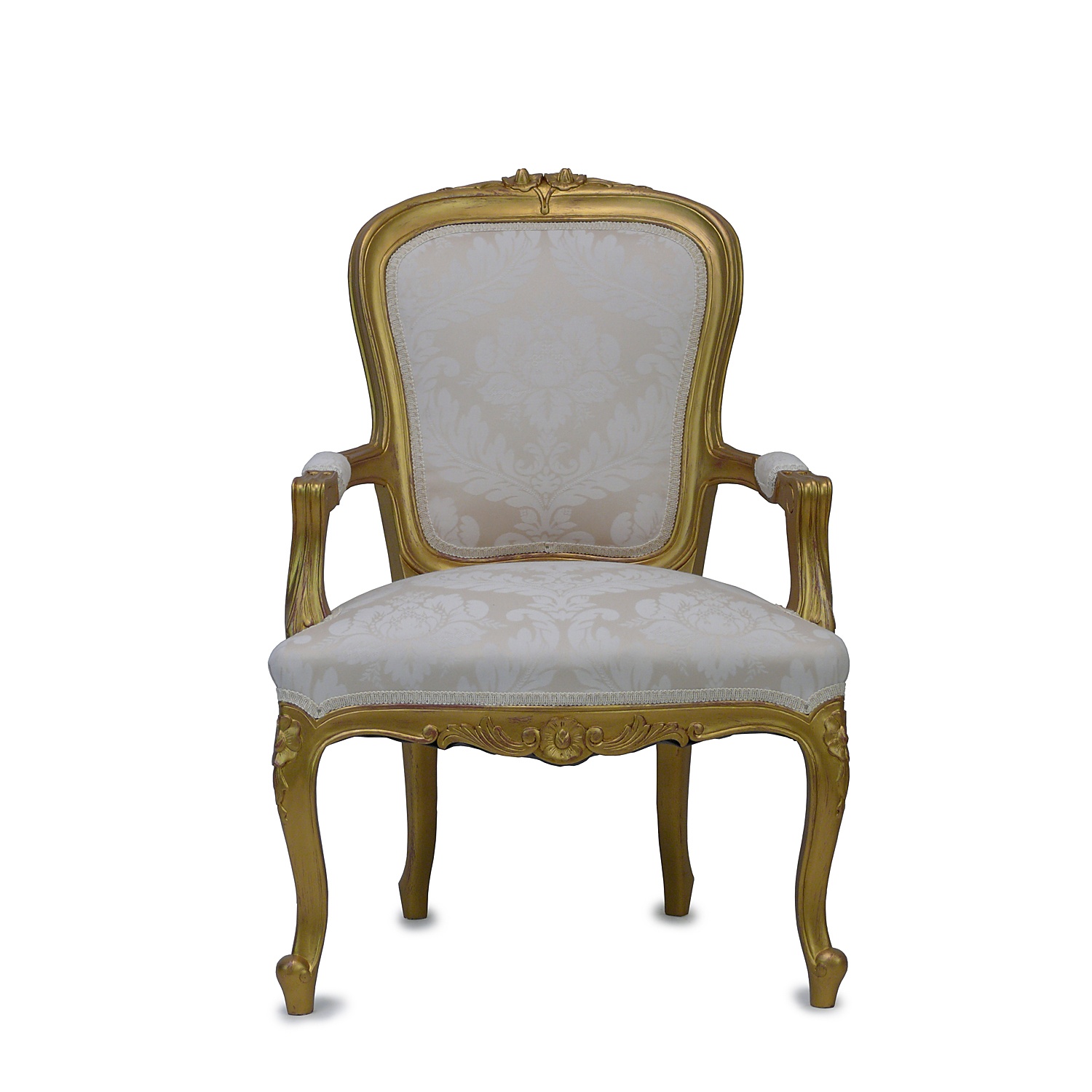 LOUIS XV LARGE GILTWOOD OPEN ELBOW CHAIR PALE CREAM DAMASK UPHOLSTERY 94 CM HIGH 65 CM WIDE 53 CM DEEP (X12)