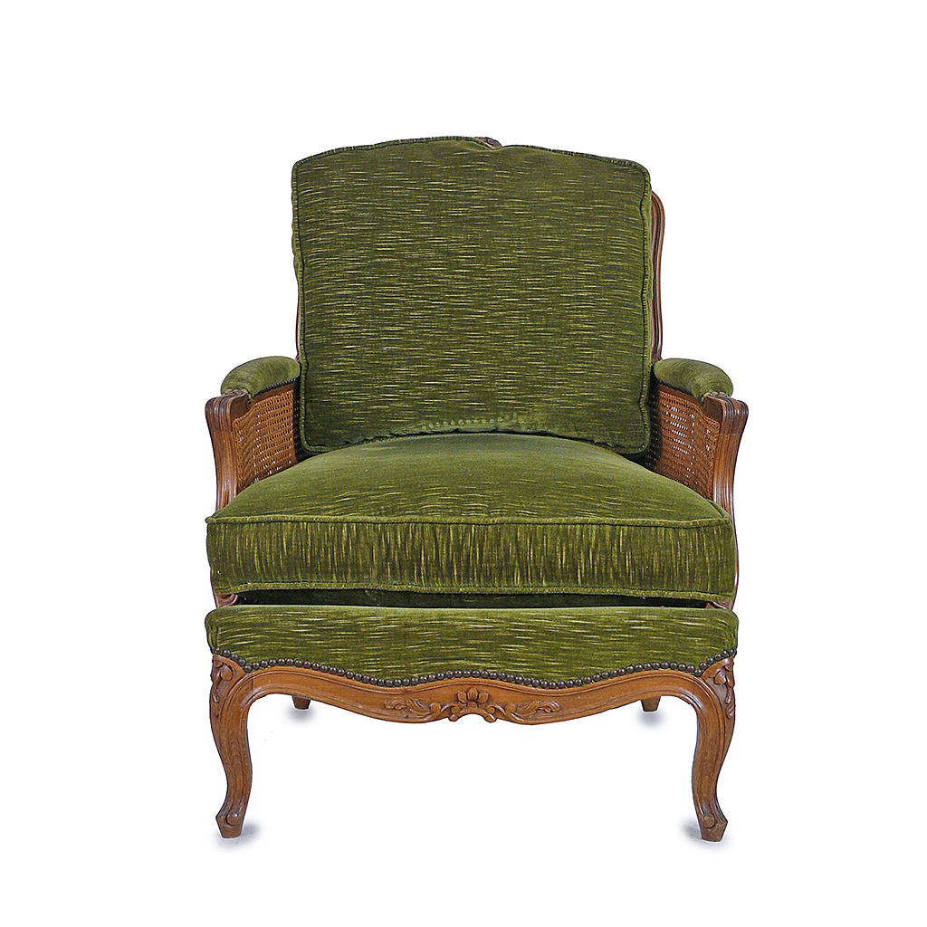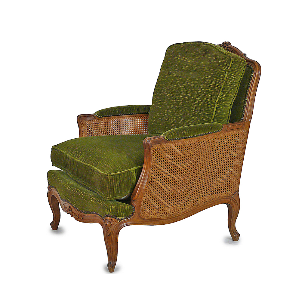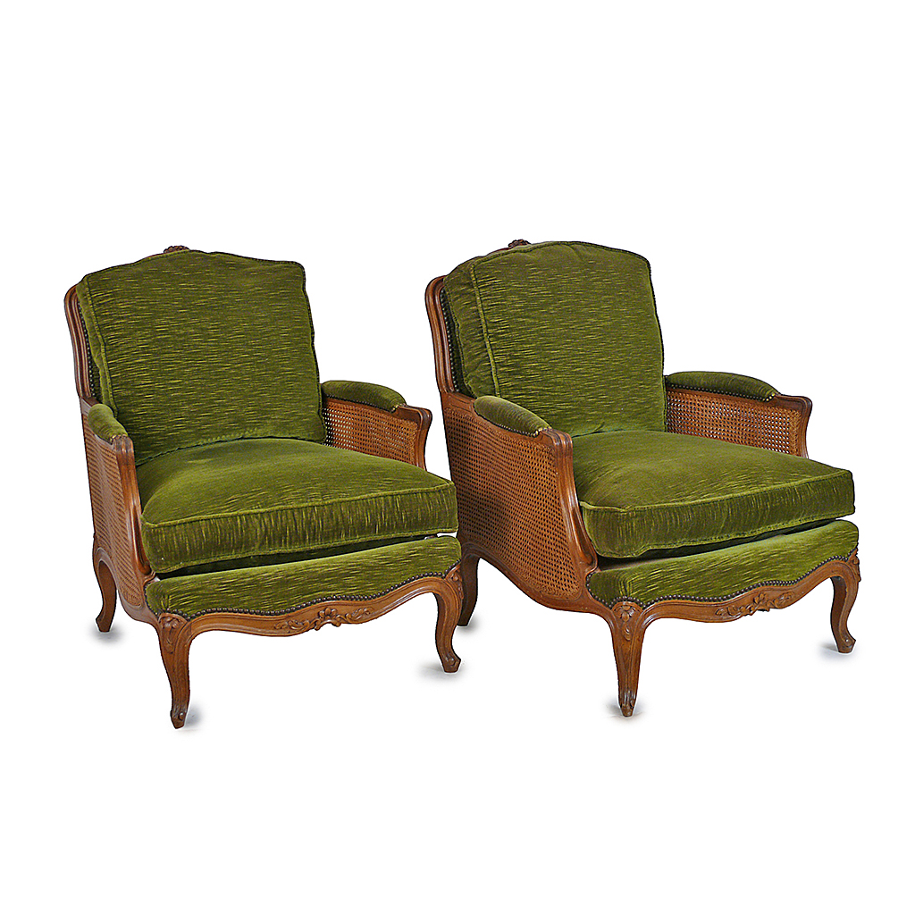 LOUIS XV STYLE BERGER ARM CHAIR CARVED FRUITWOOD WITH RATTAN CANE SIDES GREEN VELVET UPHOLSTRY AND FITTED CUSHIONS 82 CM HIGH 73 CM WIDE 86 CM DEEP (X2)