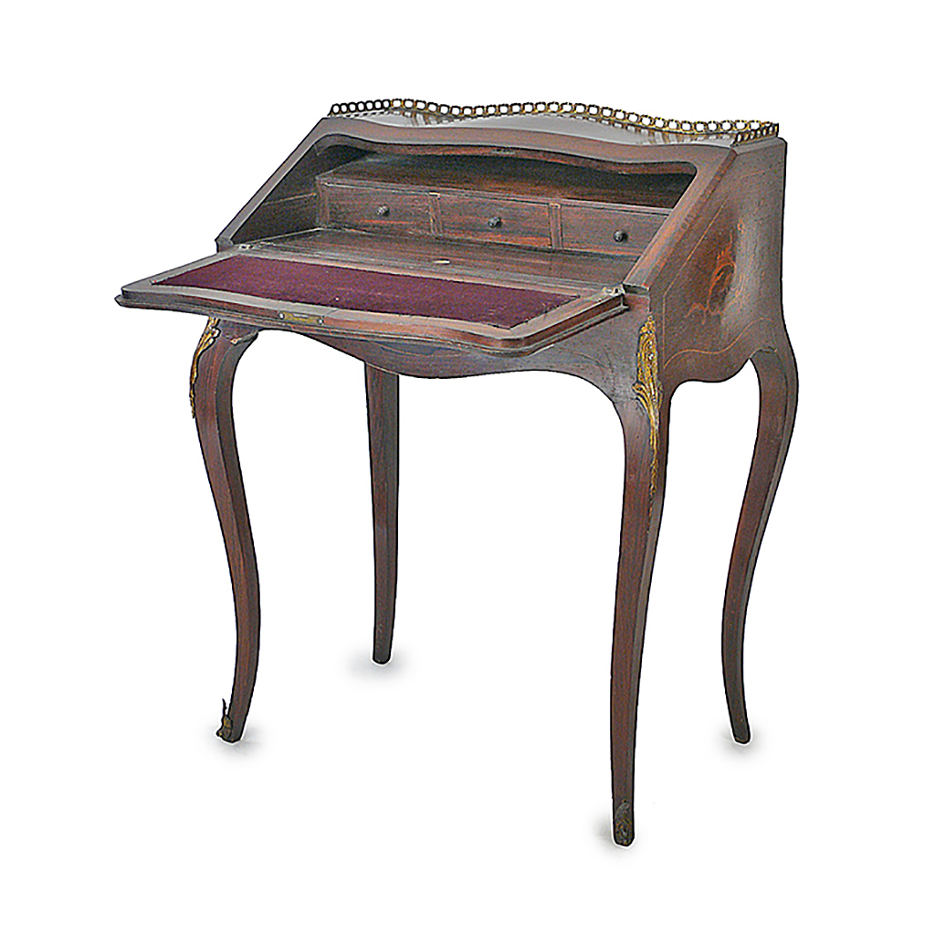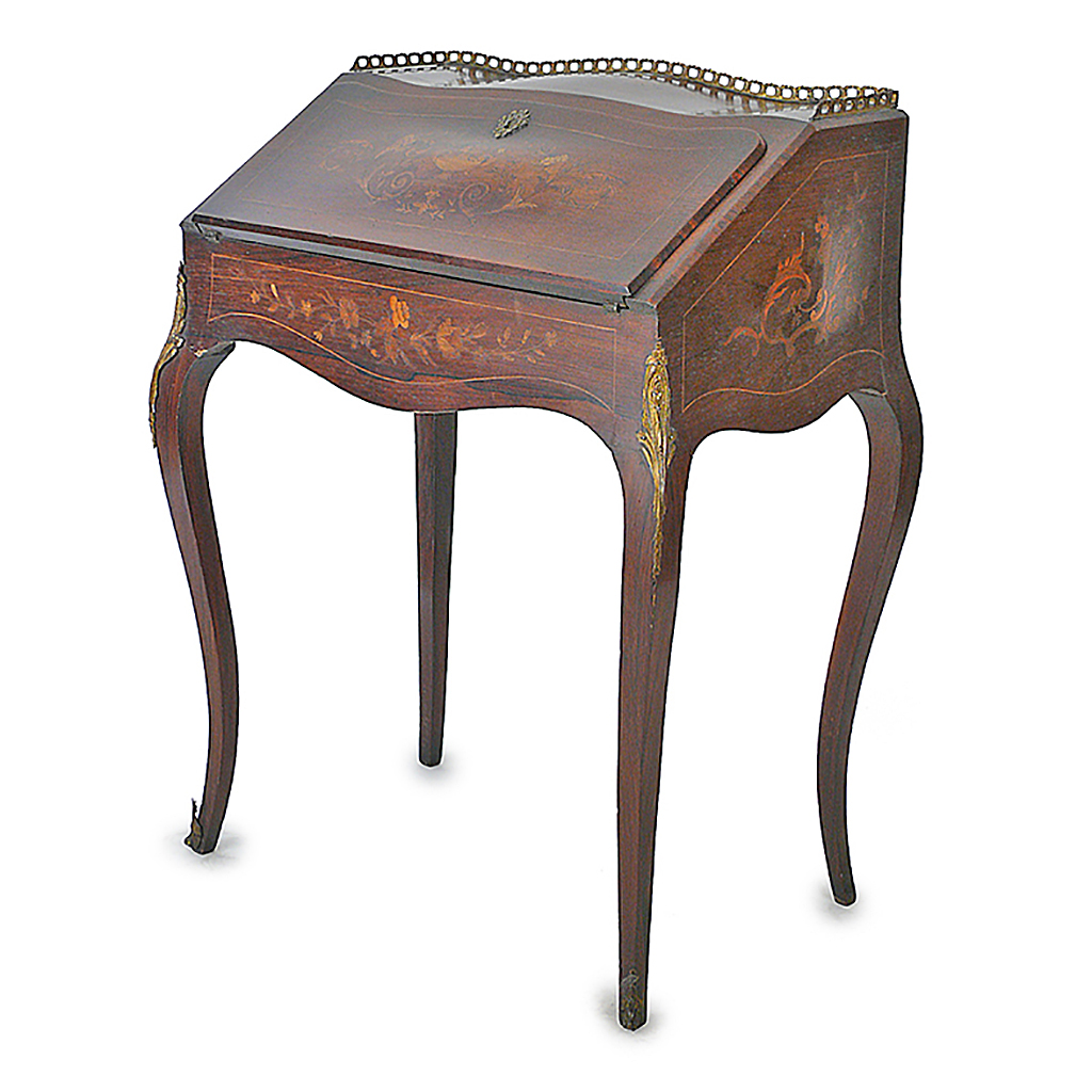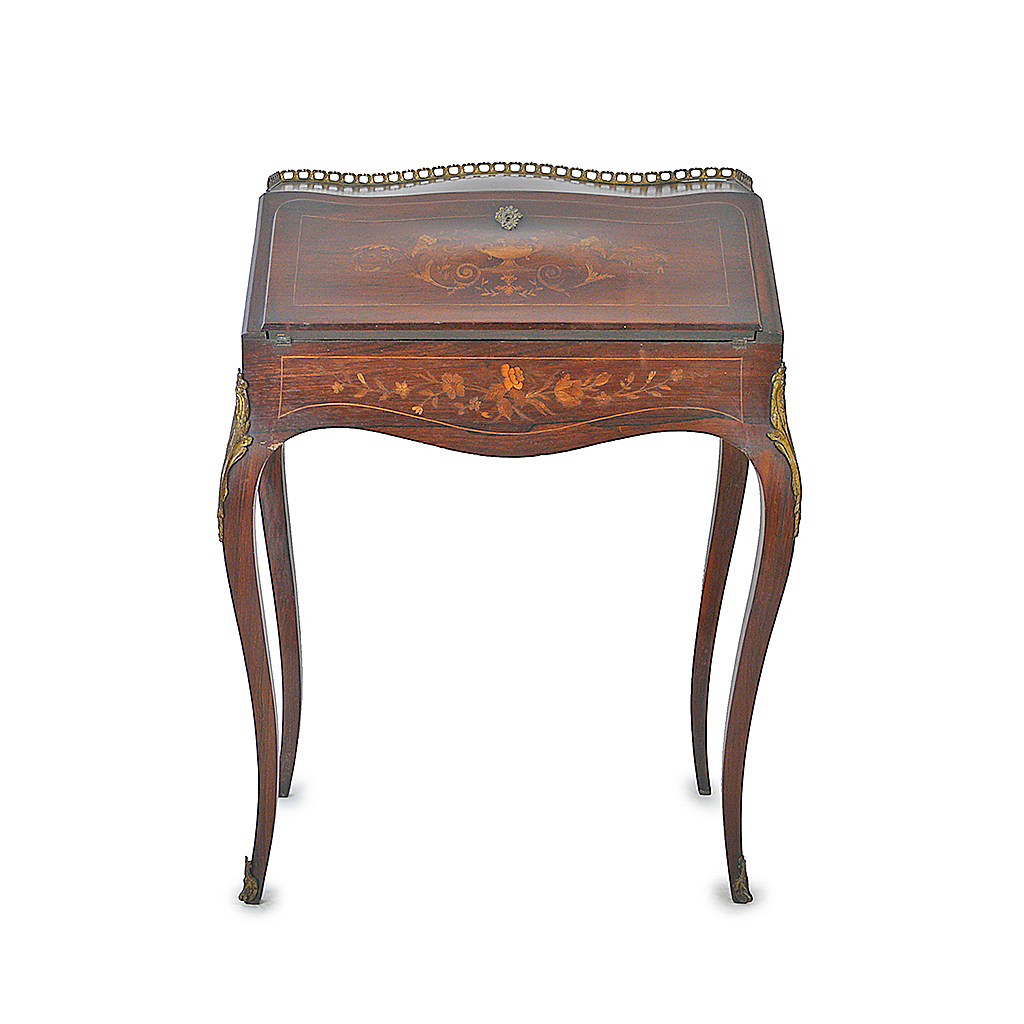 LOUIS XV STYLE BUREAU DE DAME / DESK MARQUETRY INLAID WITH ORMOLU GALLERY MOUNT 93 CM HIGH 68 CM WIDE 47 CM DEEP