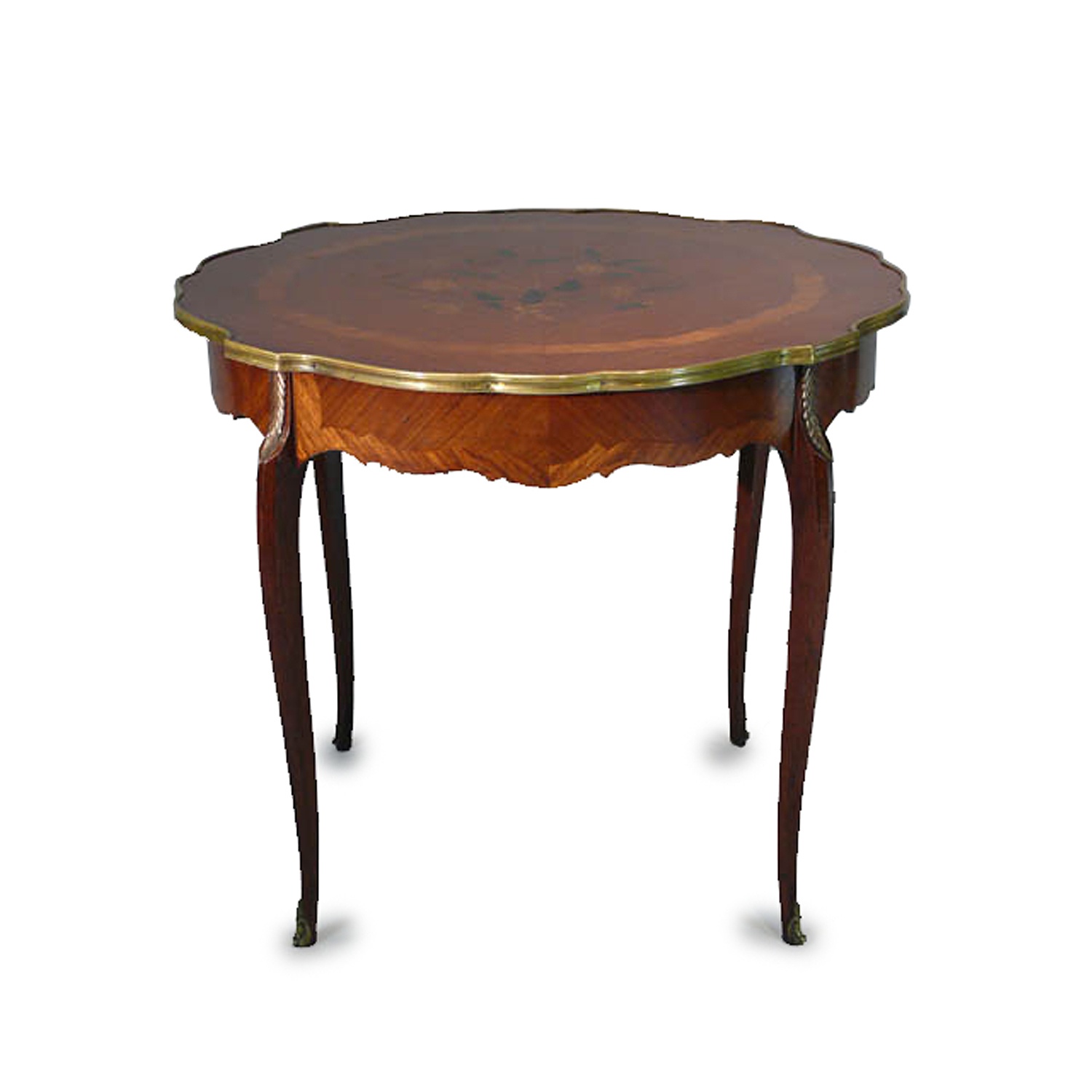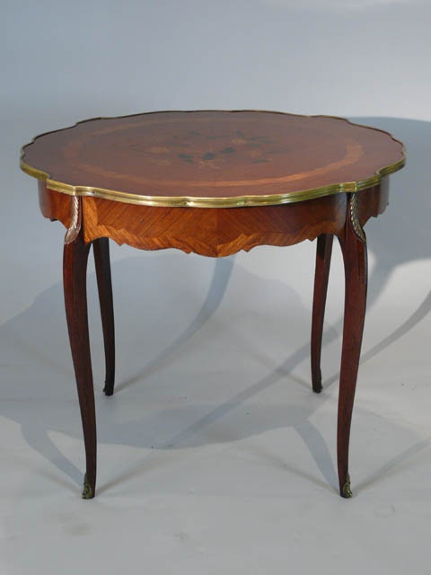 LOUIS XV STYLE FLORAL MARQUETRY INLAID OCCASIONAL TABLE CIRCULAR SHAPED TOP WITH ORMOLU MOUNTS AND RIM 67 CM HIGH 80 CM DIAM. (X2)