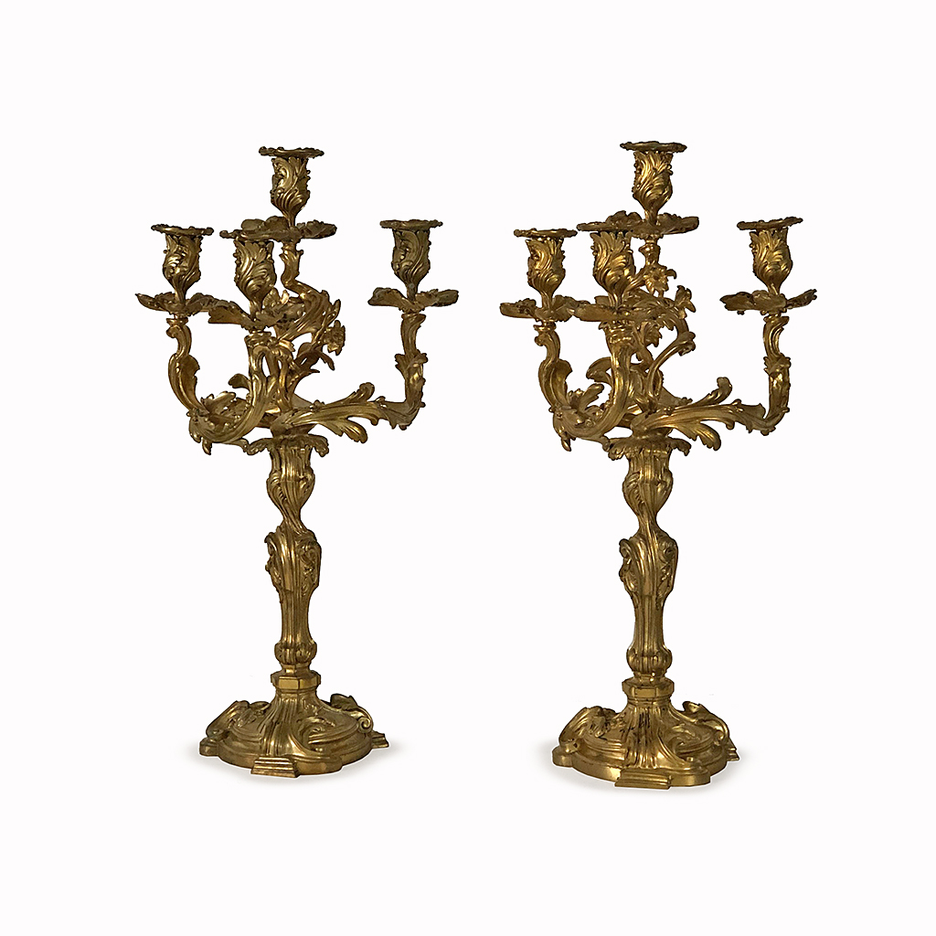 LOUIS XV STYLE ORMOLU ROCOCO CANDELABRA THREE BRANCH FOUR LIGHT 56 CM HIGH 30 CM WIDE (X2)