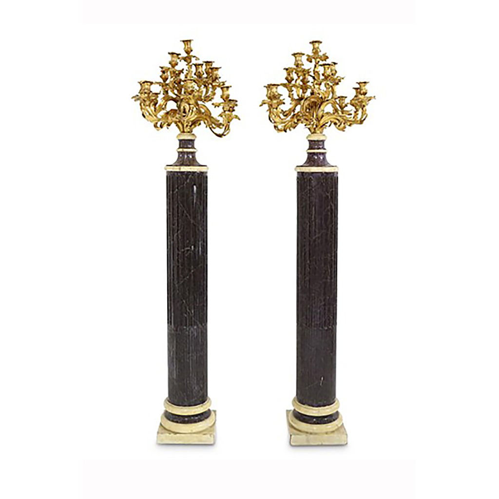LOUIS XV STYLE ROCOCO ORMOLU CANDELABRA FLOOR STANDING ON FAUX PORPHYRY AND MARBLE COLUMN BASE 195 CM HIGH (X2)