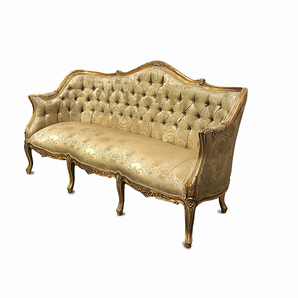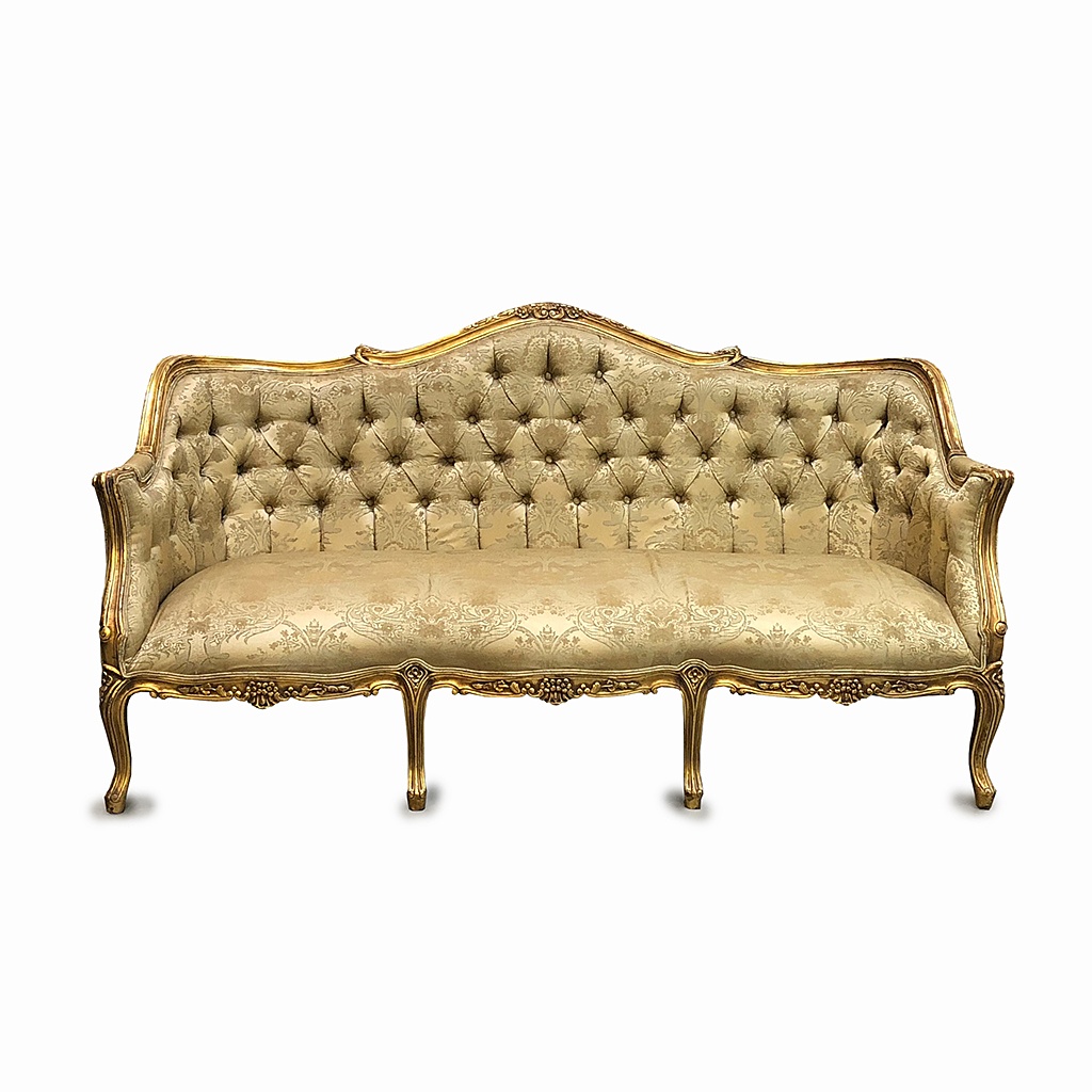 LOUIS XV STYLE SOFA / SETTEE CARVED AND GILT WITH DEEP BUTTONED GOLD SILK UPHOLSTERY 105 CM HIGH 200 CM LONG 76 CM DEEP (X2)