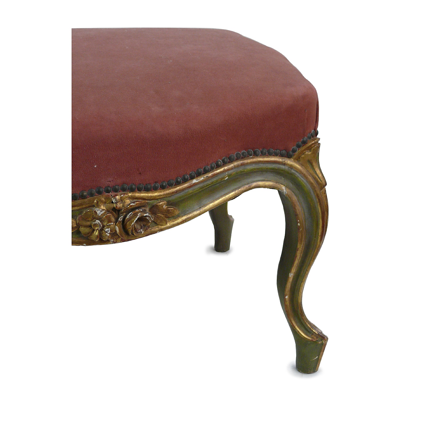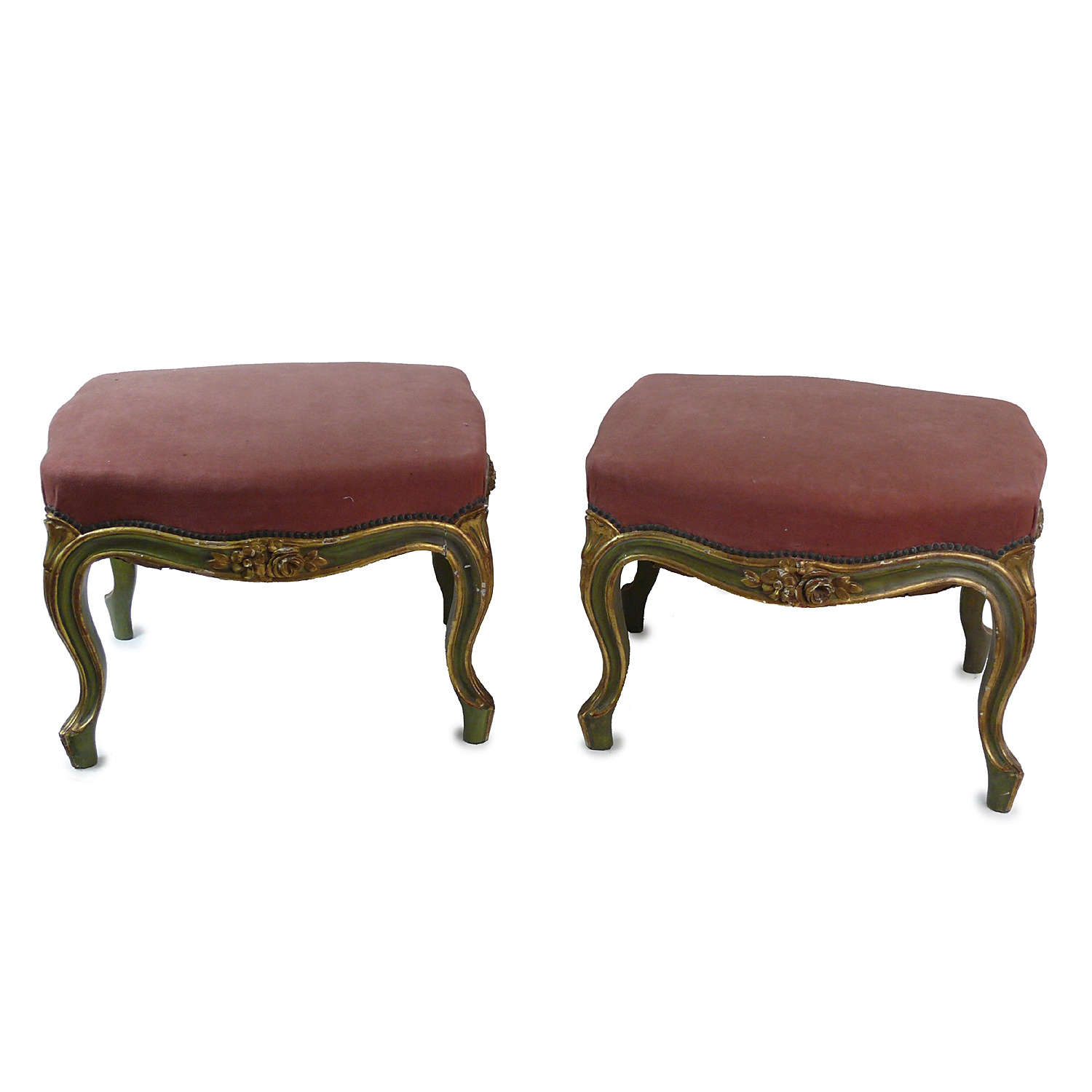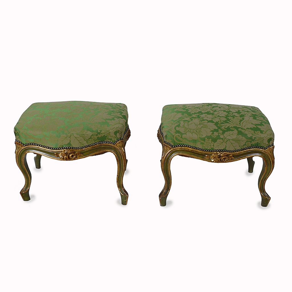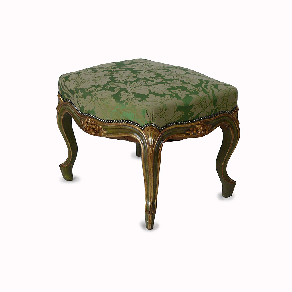 LOUIS XV STYLE TABOURET STOOL GREEN AND GILT WITH GREEN SILK DAMASK UPHOLSTERY 45 CM HIGH 56 CM WIDE 42 CM DEEP(X4)