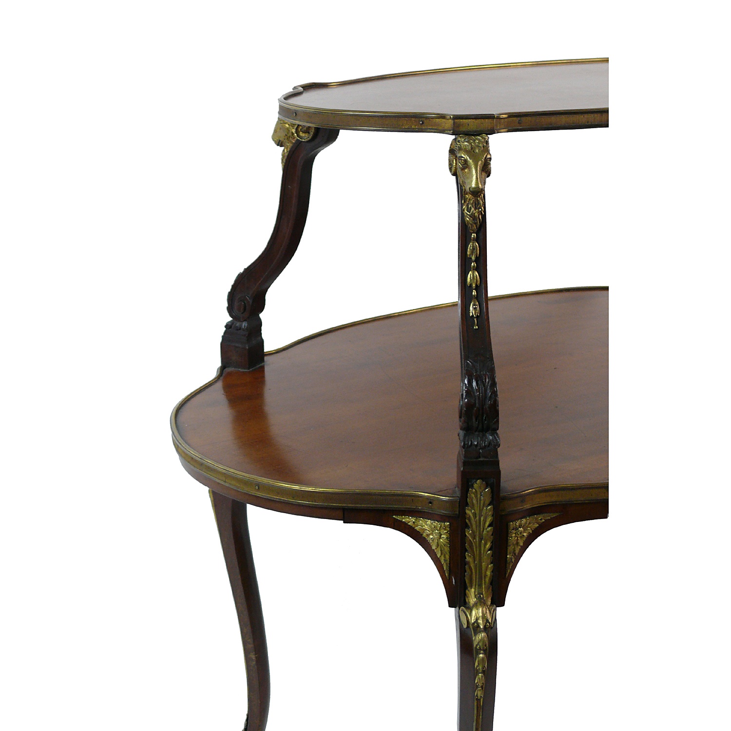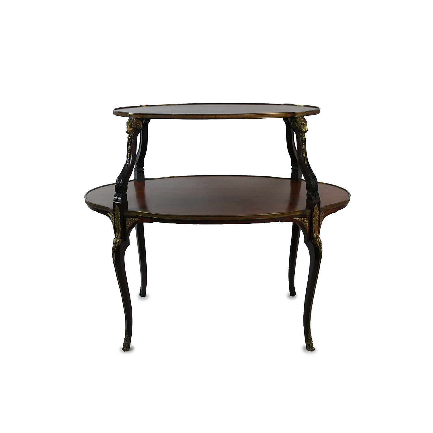 LOUIS XV STYLE TEA TABLE TWO TIER SHAPED OVAL WITH ORMOLU RAMS HEAD MOUNTS 79 CM HIGH 91 CM WIDE