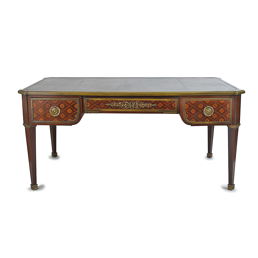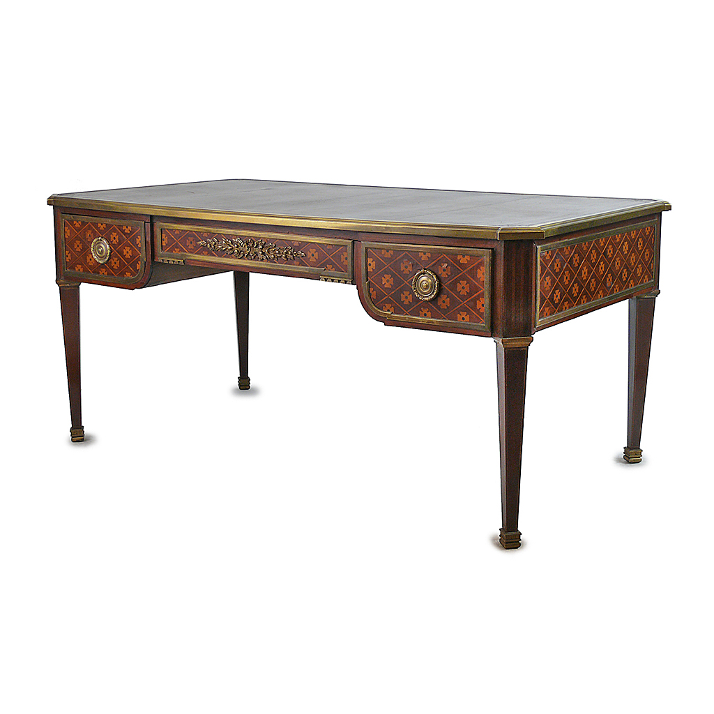 LOUIS XV / XVI STYLE TRANSITIONAL DESK / BUREAU - PLAT WRITING TABLE FLORAL MARQUETRY INLAID TAN LEATHER TOP ORMOLU MOUNTS AND CANTED CORNERS 76 CM HIGH 163 CM LONG 92 CM WIDE