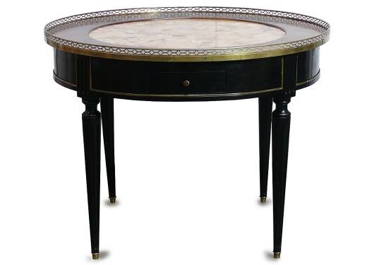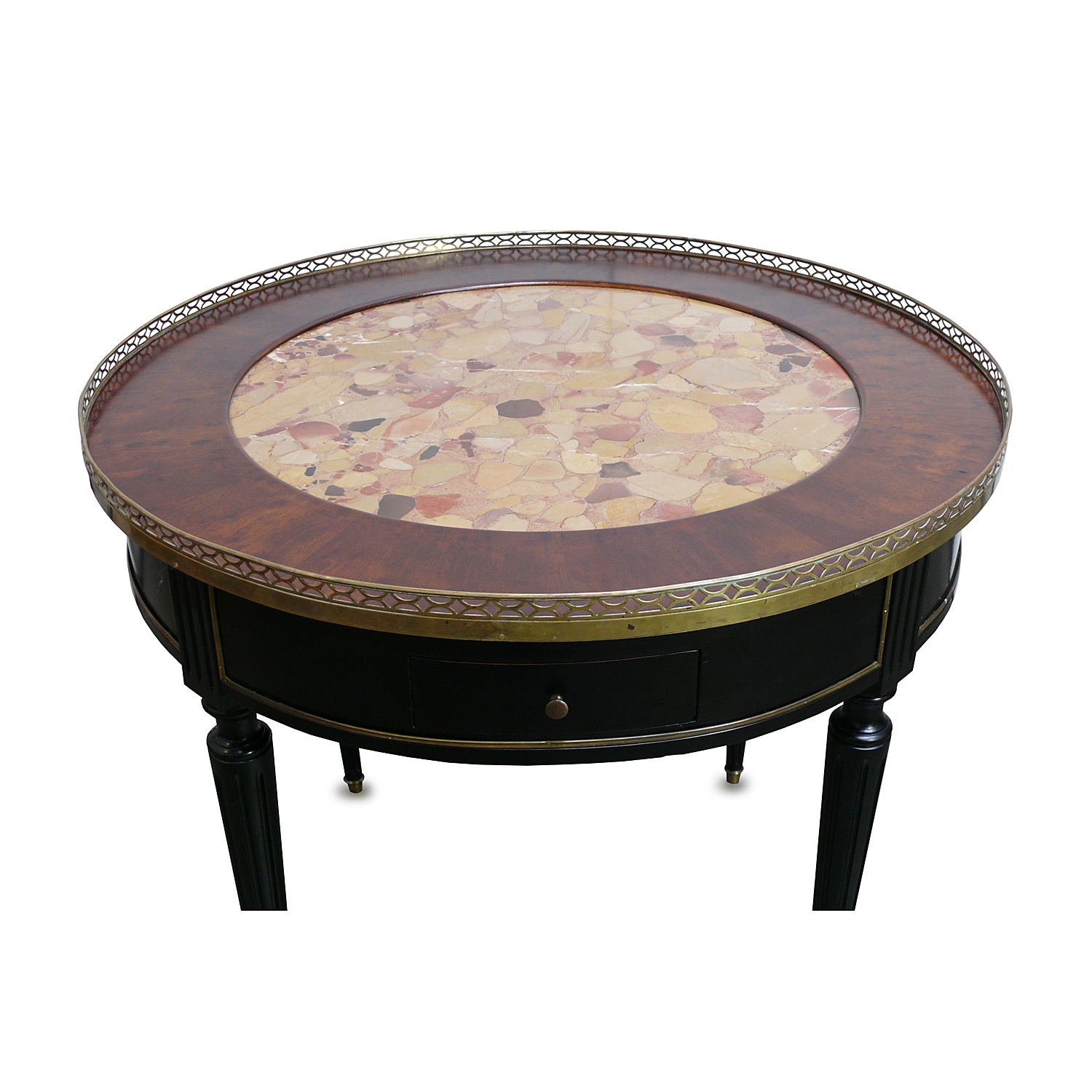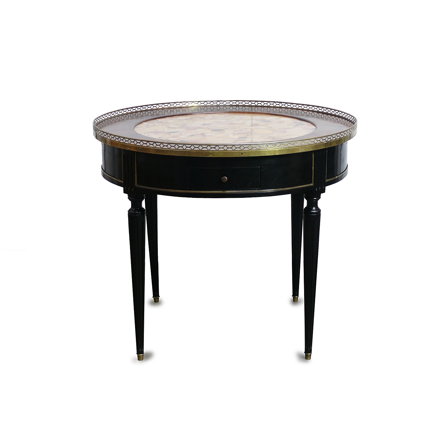 LOUIS XVI CIRCULAR CENTRE TABLE EBONISED WITH YELLOW ALEP BRECCIA MARBLE INSET TOP AND BRASS FRET GALLERY EDGE 77 CM HIGH 90 CM DIAM
