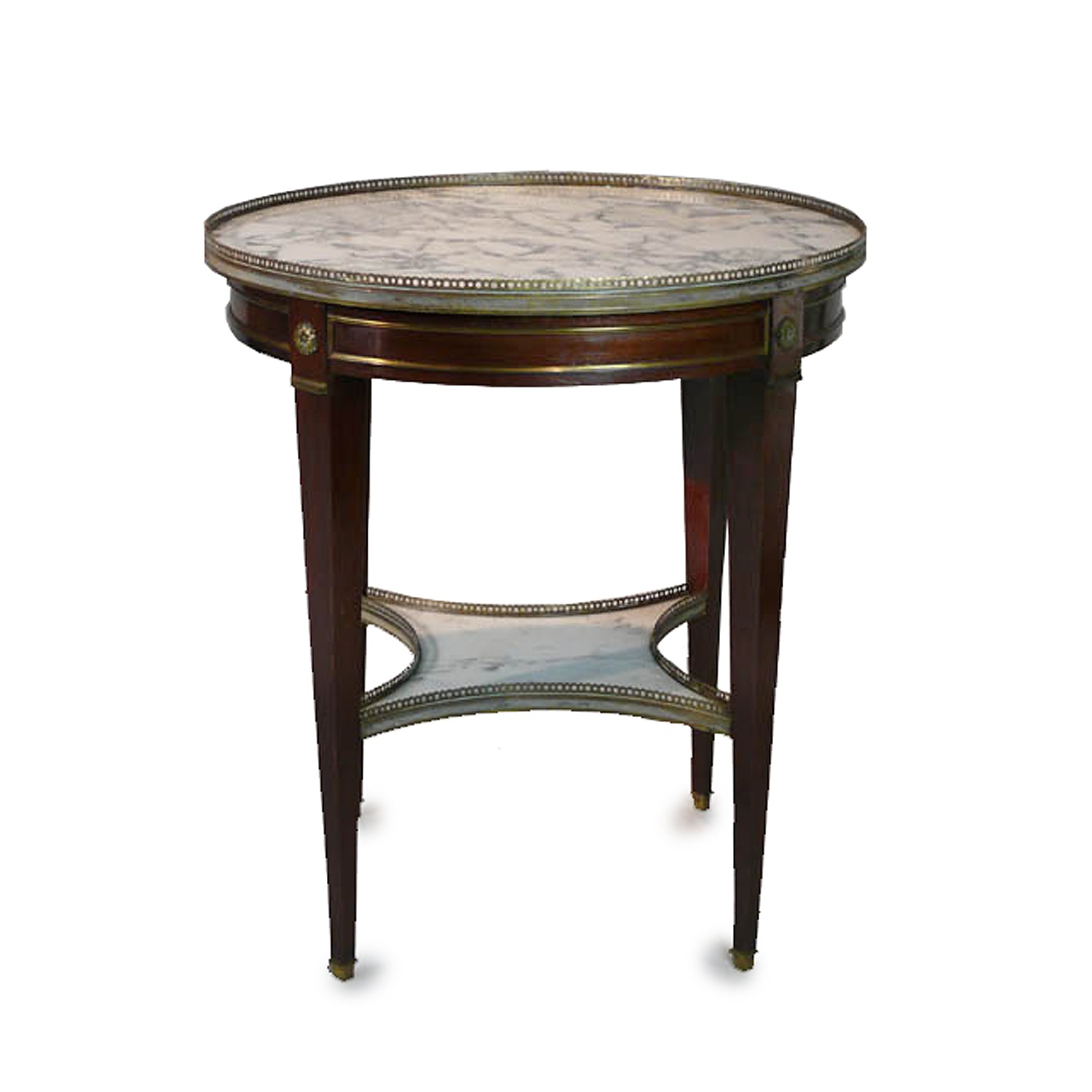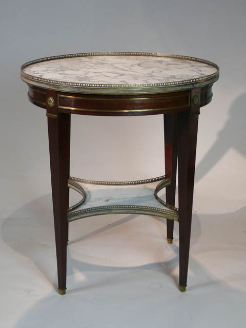 LOUIS XVI CIRCULAR MAHOGANY OCCASIONAL TABLE WHITE MARBLE TOP GALLERY EDGE MARBLE LOWER TIER 70 CM HIGH 64 CM DIAM (X2)